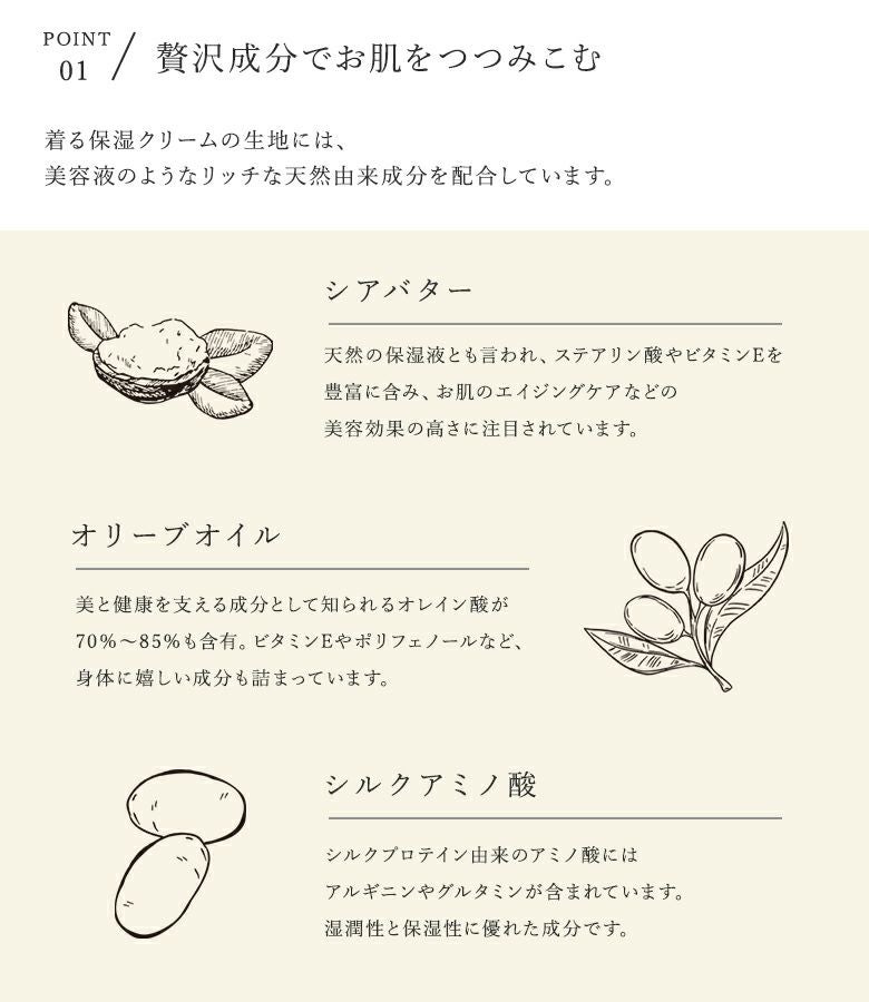 シアバター、オリーブオイル、シルクアミノ酸の3種類のお肌に優しい天然由来成分を配合した、水分率の高い生地はまるで”着る保湿クリーム”。贅沢成分でお肌を包みこみ、乾燥からお肌を守ります。