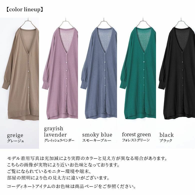 ブラック購入。涼ニットカーデの他タイプが良かったので、こちらのロングも買いました。夏に涼しく着れてとても良いです。