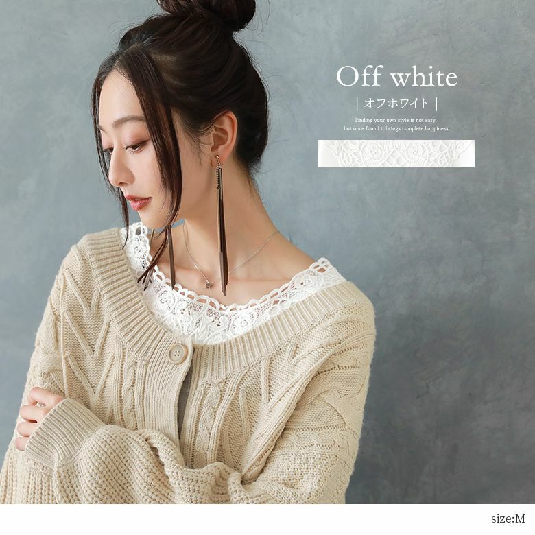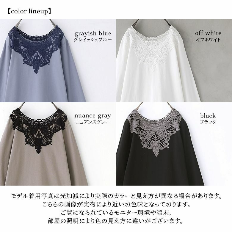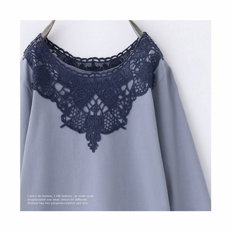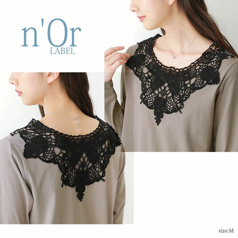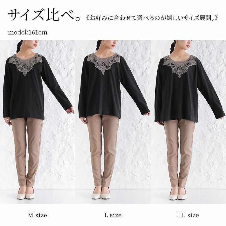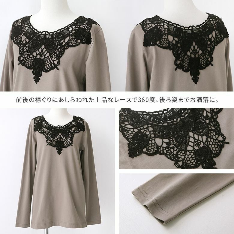 前後の襟ぐりにあしらわれた上品なレースは、カットソーと微配色で後ろ姿まで抜かりなくお洒落に。M~LLサイズからお好みのシルエットをお選びいただけます。