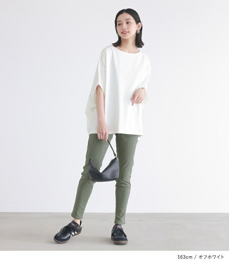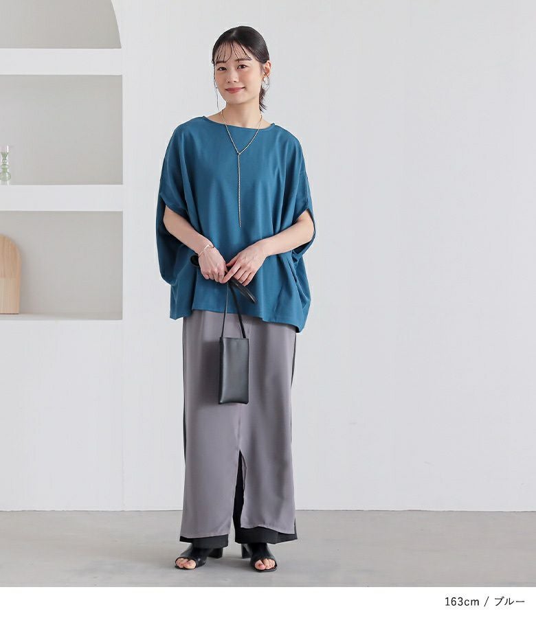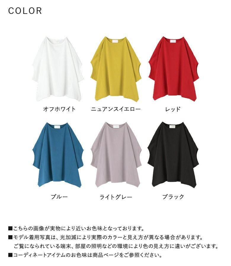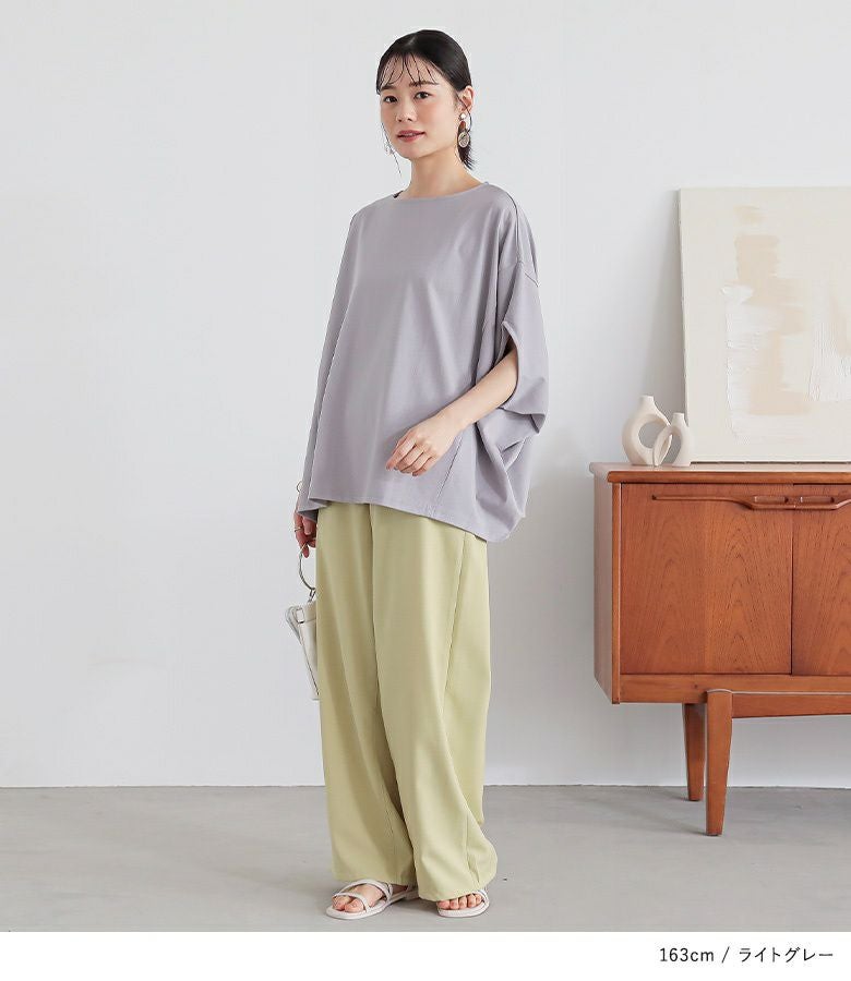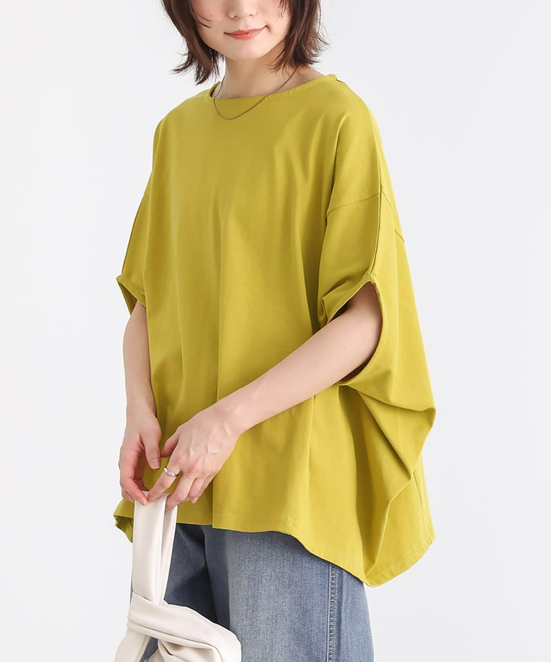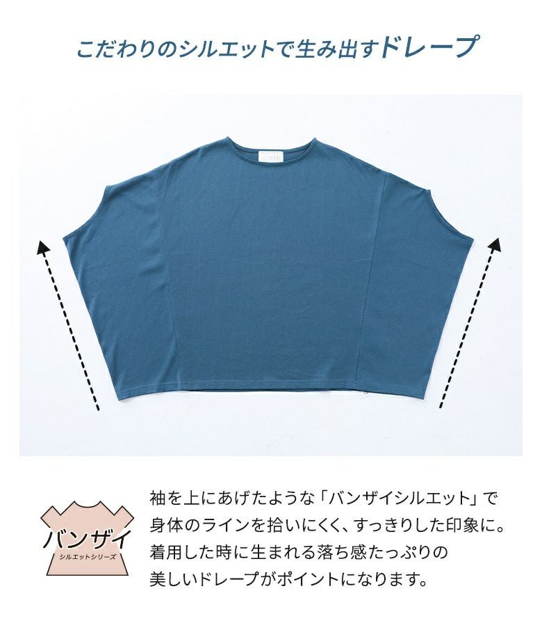 袖を上にあげたような、バンザイシルエットが特徴のドルマンカットソー。生地を贅沢に使用した、たっぷりの分量感が落ち感たっぷりのドレープを作り、身体のラインを拾いにくく、すっきりキレイな印象に仕立ててくれます。