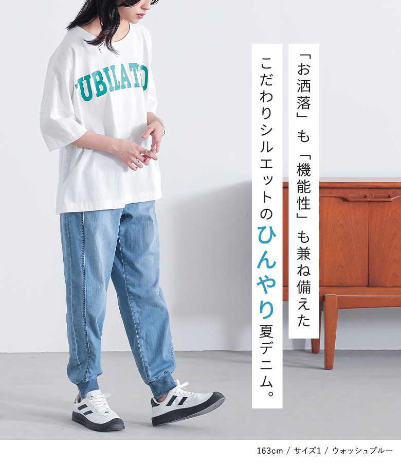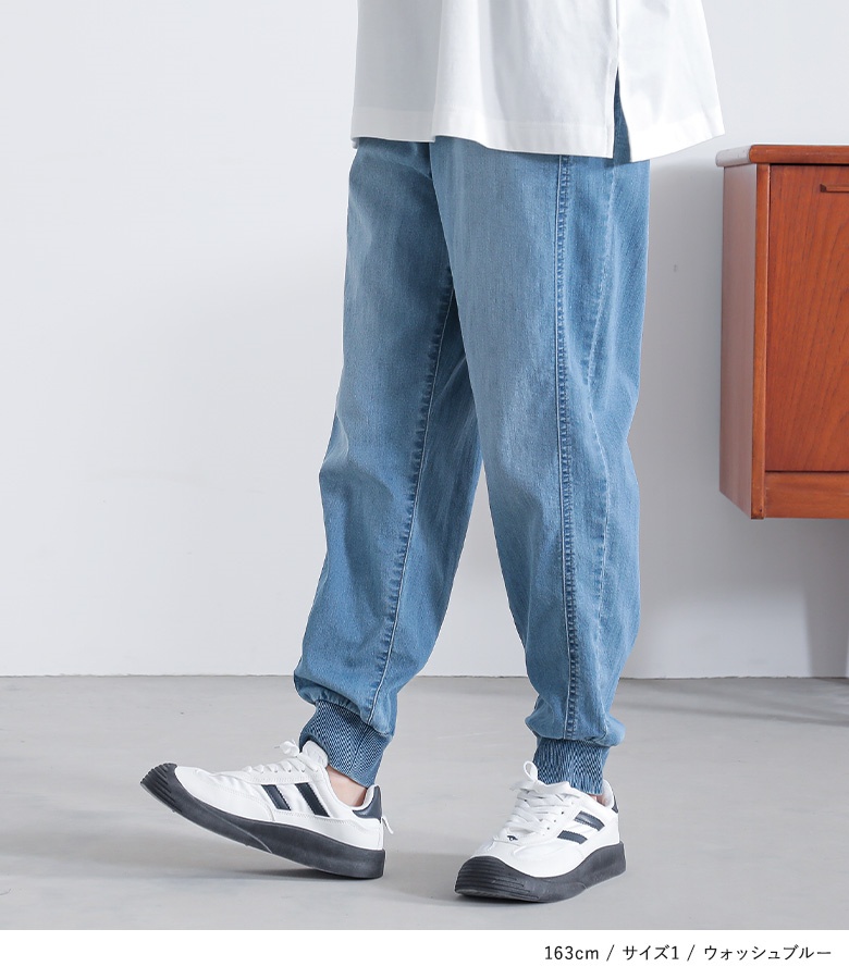 ヒップ周りはゆったりと、足首に向かって細くなるテーパードシルエットが魅力のひんやり冷感デニムジョガーパンツ。脚長効果が期待できる縦に入れたシーム切り替えと、ヴィンテージ感のあるブラスト加工がこなれ感をプラスします。足首はメリハリのあるリブデザインですっきりシルエットに。前後には便利なポケット付きです。