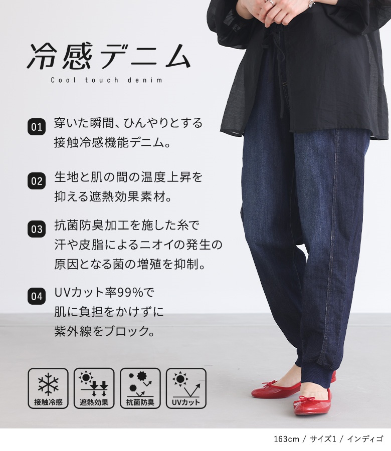 遮熱糸を生地に使用することで、一般的な生地よりも熱を伝えにくく、生地と肌の間の温度上昇を抑える接触冷感のひんやりデニム素材。ストレッチの効いた薄手で軽いデニムで、暑い季節も快適にご着用いただけます。UVカット率99%で肌に負担をかけずに紫外線をブロック。また、抗菌防臭加工を施した糸を使用し、汗や皮脂による臭いの発生源となる菌の繁殖を抑えます。