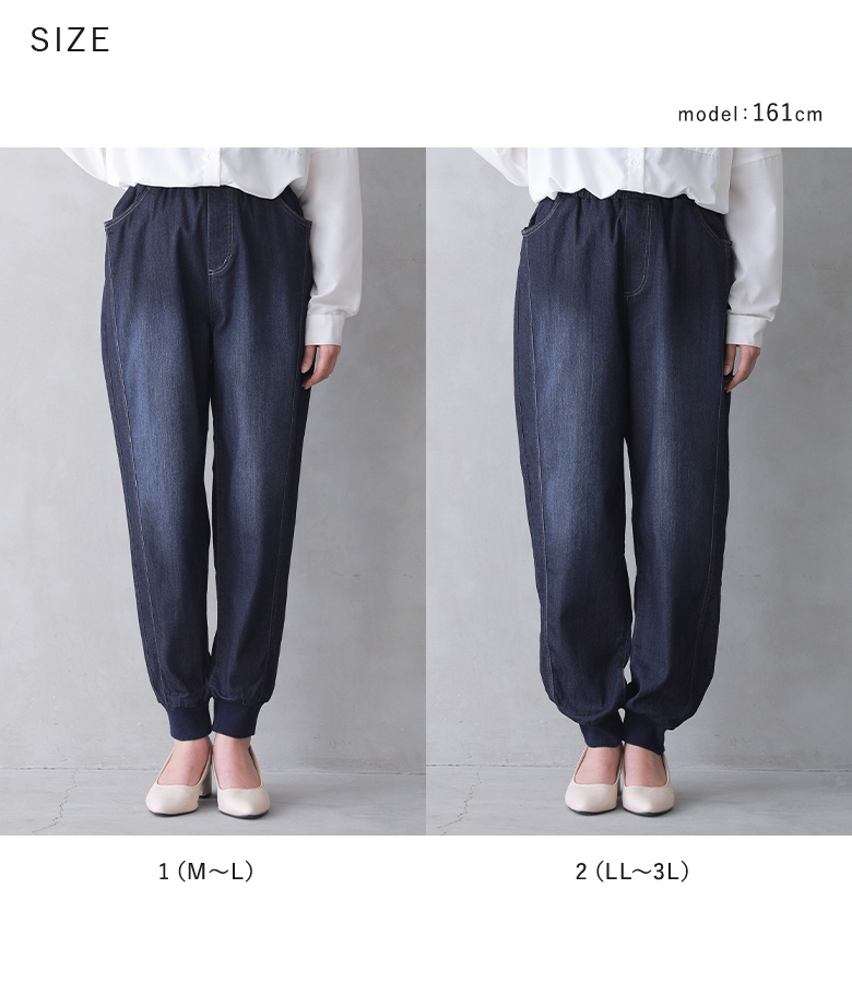 1(M~L)は、ゆったりめのサイズ感ですがルーズすぎることもなく、スッキリとしたシルエットで穿けました。2(LL~3L)は、ウエストで穿くことはできず、かなり大きめのサイズ感でした。私の場合は、1(M~L)を選びます。