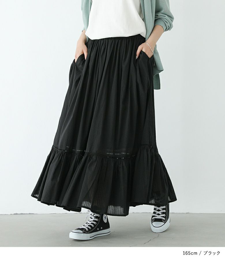 切り替えとギャザーがリズミカルな表情を生み出すフレアスカート。シンプルなデザインながらも、ストライプ織り柄のドビー生地がポイントに。ウエスト総ゴムで楽ちん。両サイドポケット付きで機能的です。