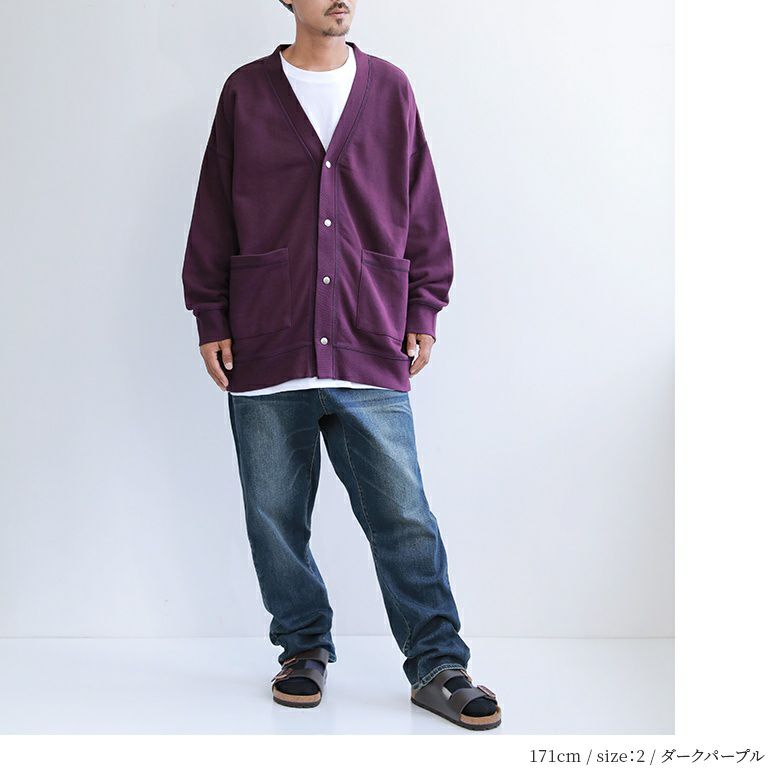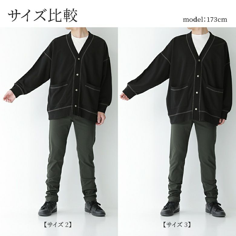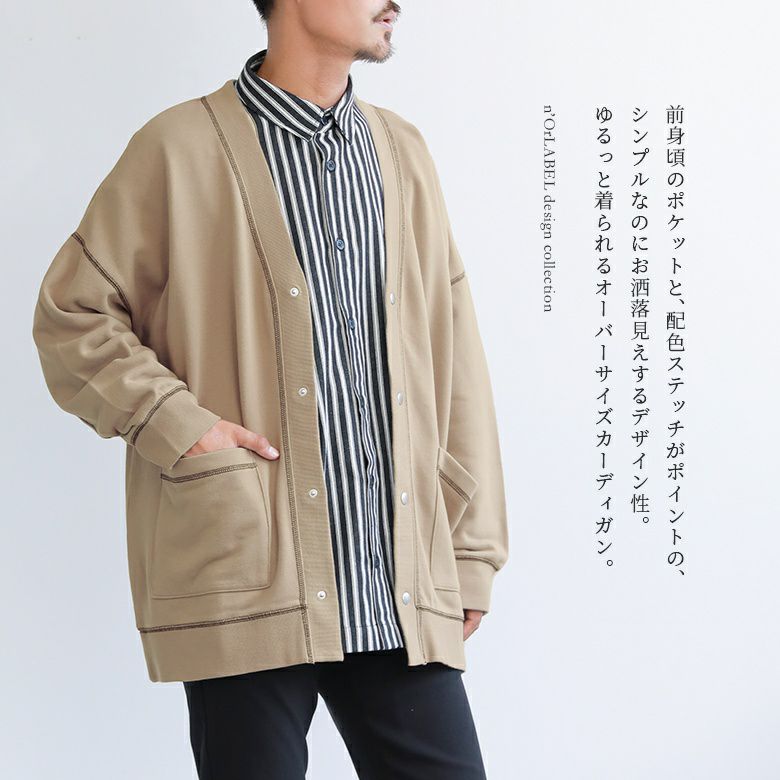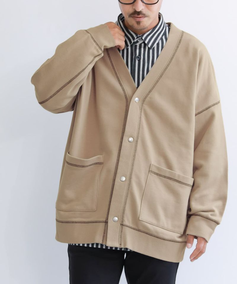 前身頃のポケットと、配色ステッチがポイントのシンプルなのにお洒落見えするデザイン性。ゆるっと着られるオーバーサイズカーディガンです。