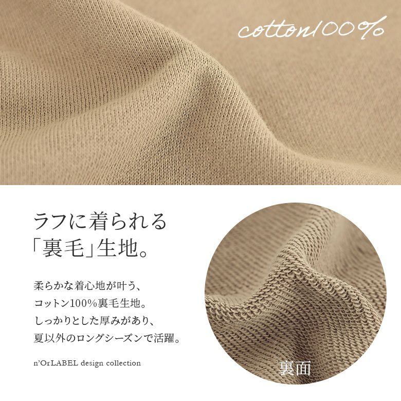 柔らかな着心地を実現するコットン100%の裏毛生地を使用。しっかりとした厚みがあり、ロングシーズン着用いただけます。