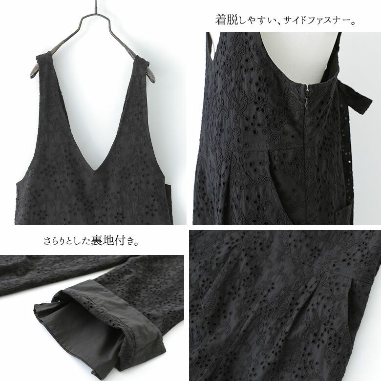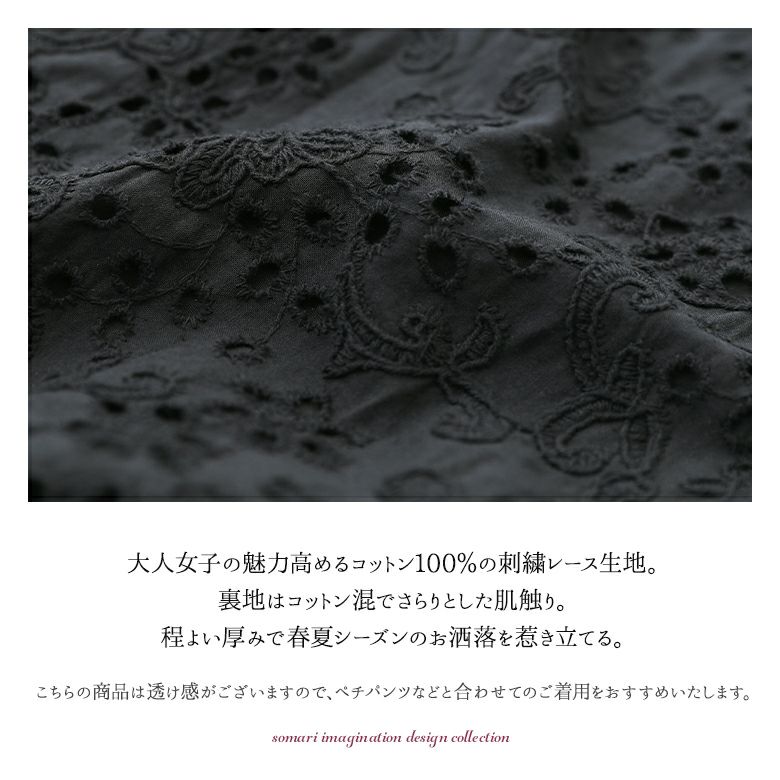 大人女子の魅力高めるコットン100%の刺繍レース生地を使用。裏地はコットン混でさらりとした肌触りです。