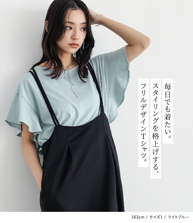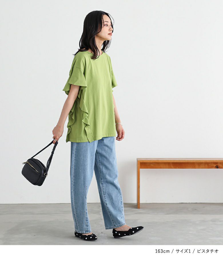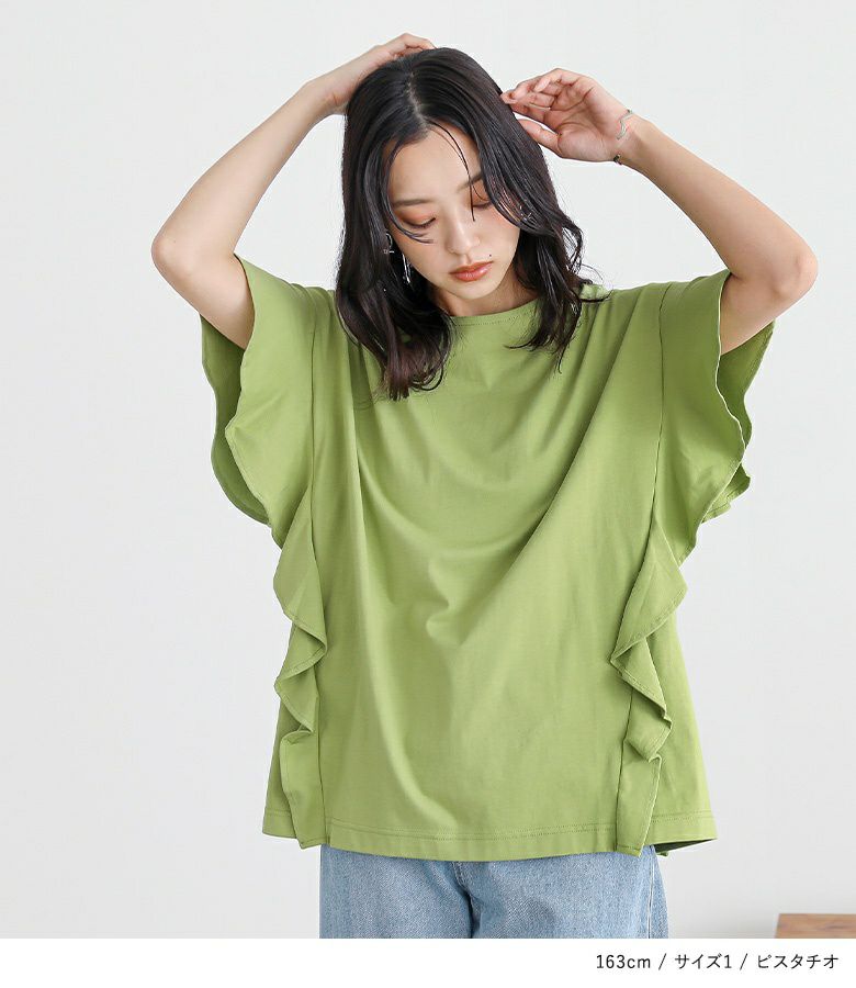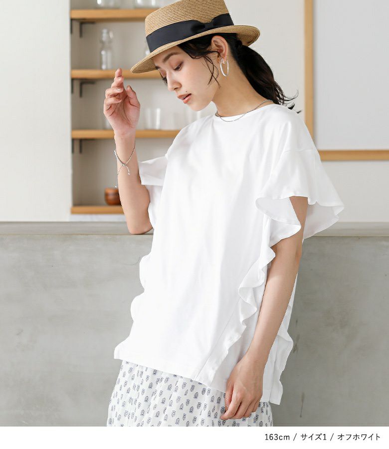 袖から裾にかけてフリルをあしらった、コーディネートのポイントになるTシャツ。可愛くなり過ぎないように計算されたフリル感と、切り替えライン&脇のマチで大人っぽく贅沢な雰囲気に仕上げました。ふわっと腕にかかる袖が、涼し気な印象です。