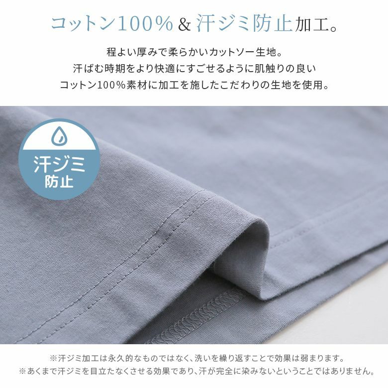 程よい厚みの柔らかなカットソー生地を使用。汗ばむ時期をより快適に過ごせるよう、肌触りの良いコットン100%素材に加工を施したこだわりの生地です。