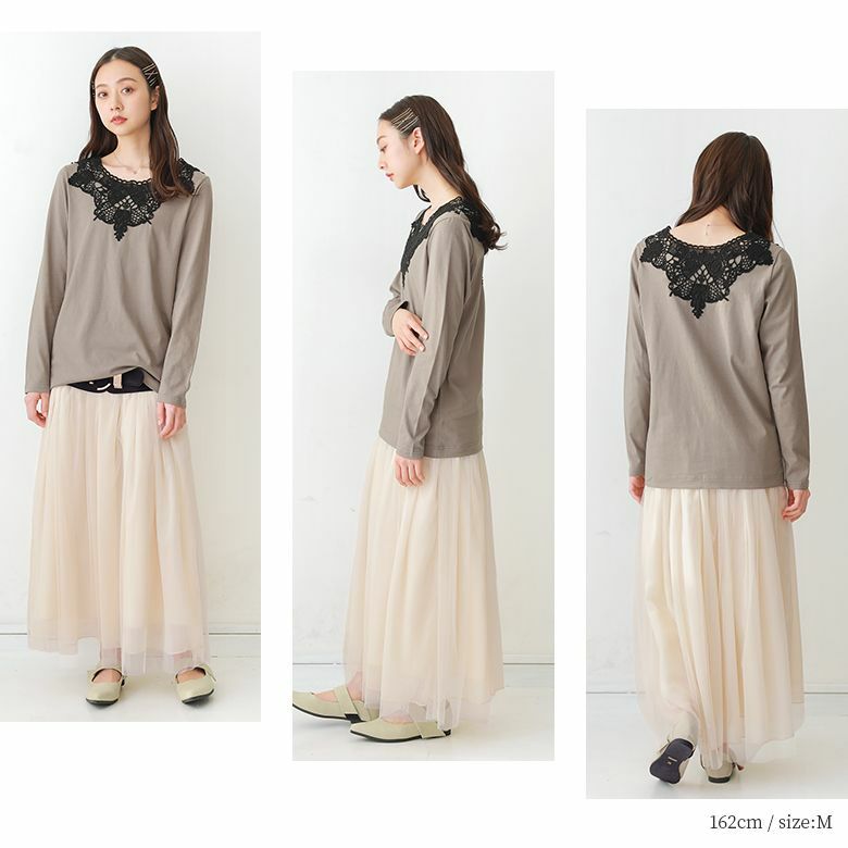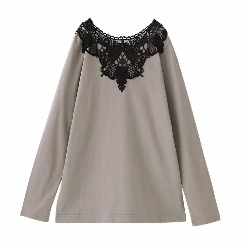 前後の襟ぐりにあしらわれた上品なレースは、カットソーと微配色で後ろ姿まで抜かりなくお洒落に。M~LLサイズからお好みのシルエットをお選びいただけます。