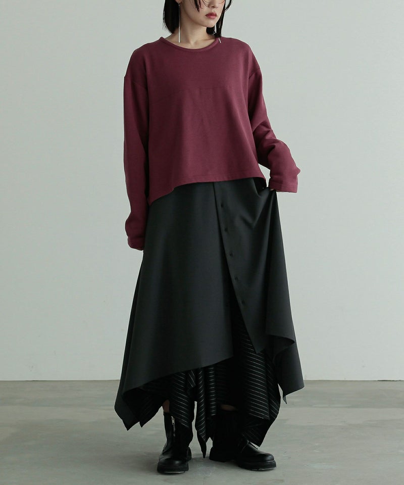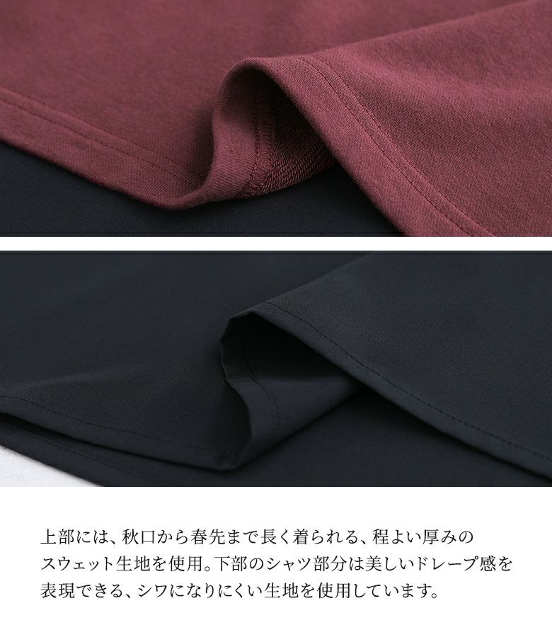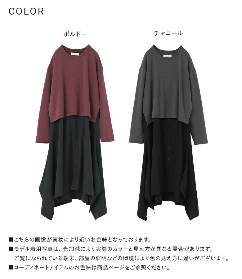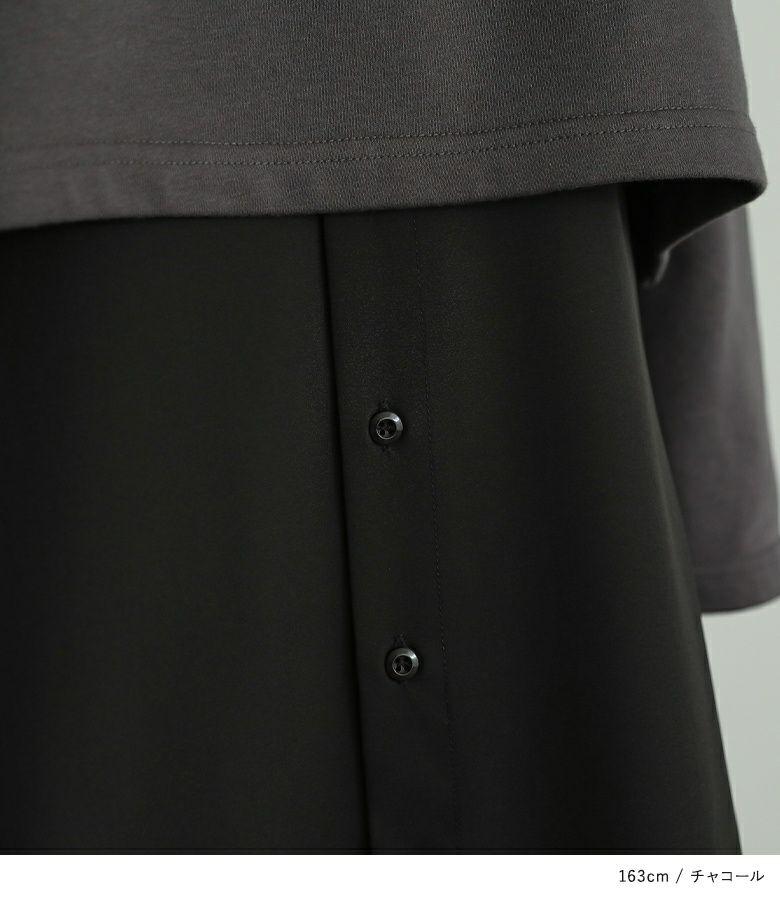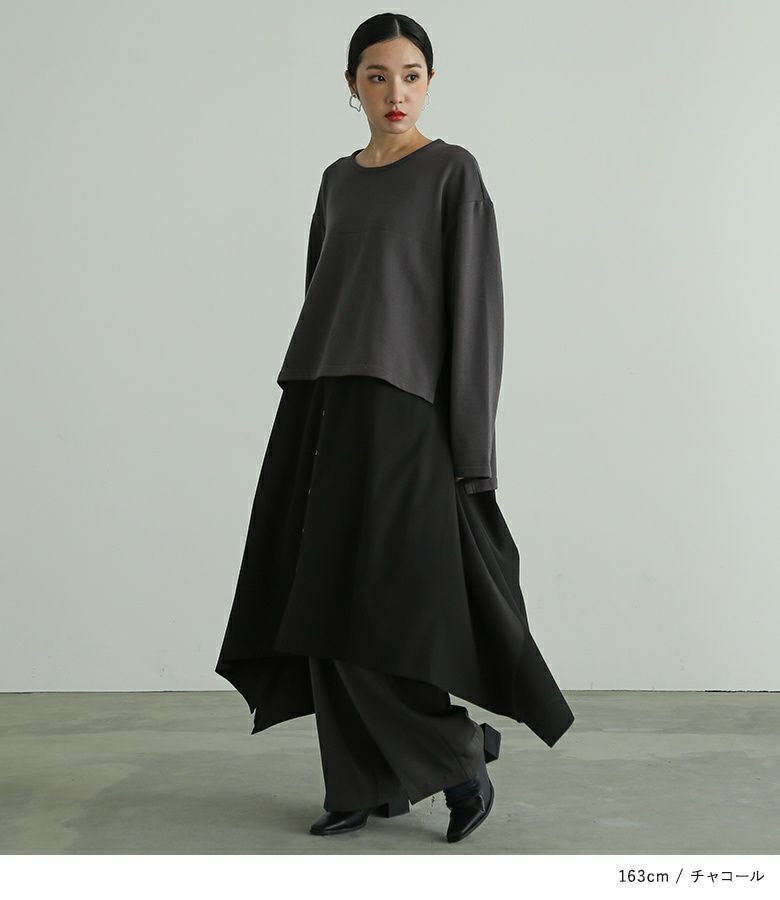 カットソーとシャツをドッキングした長袖ワンピース。
