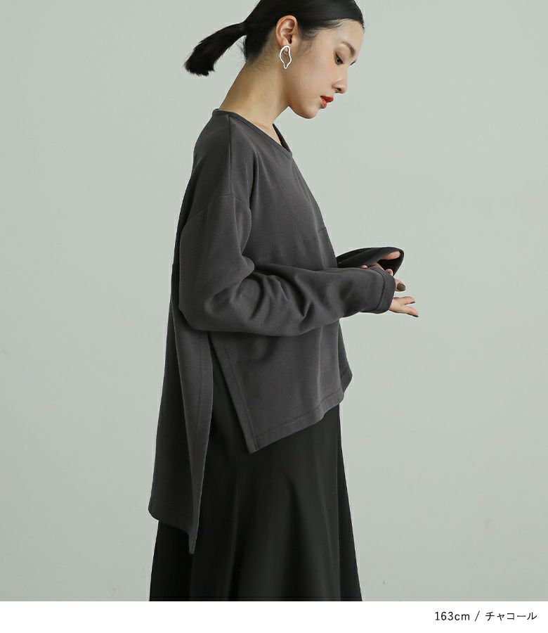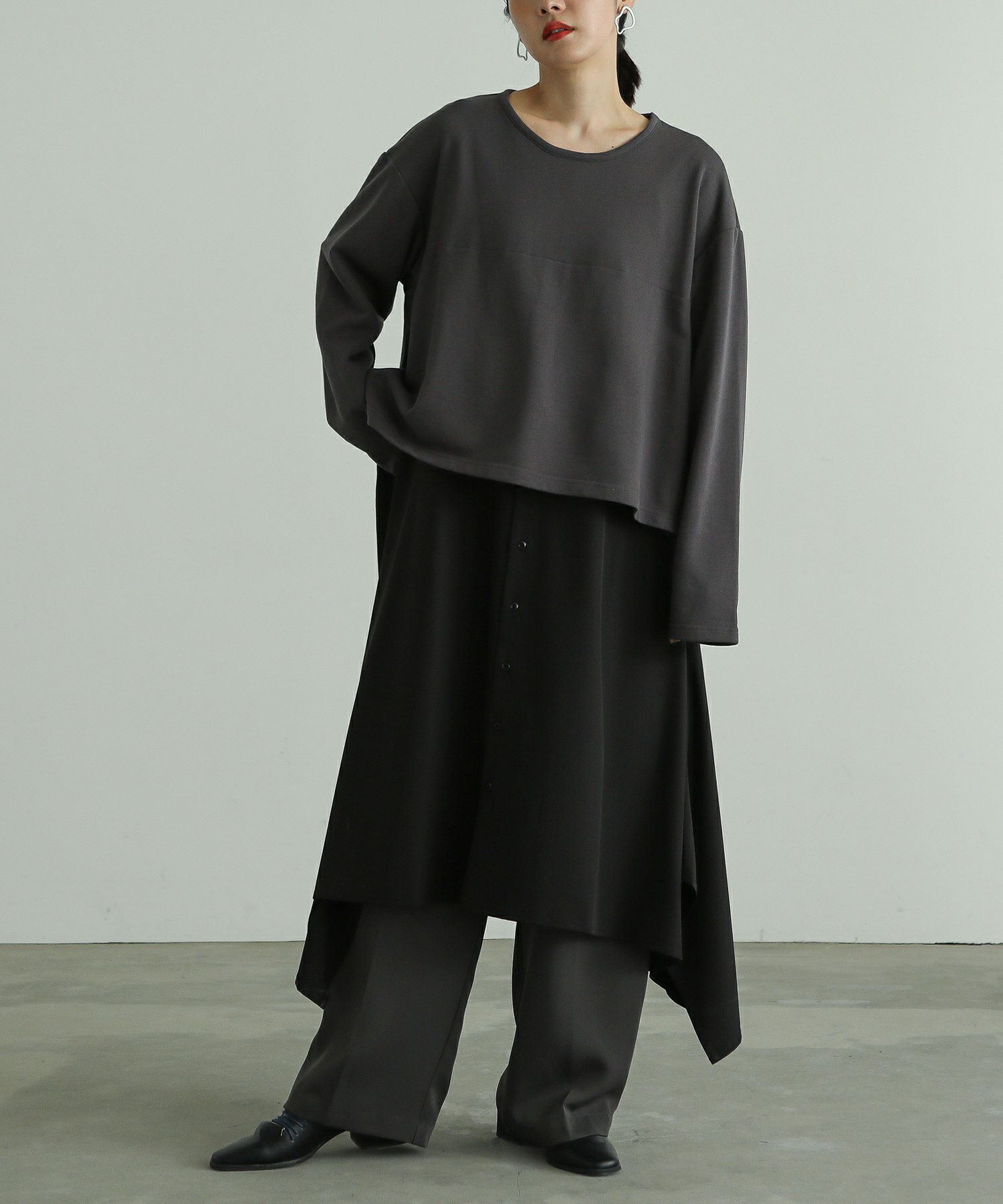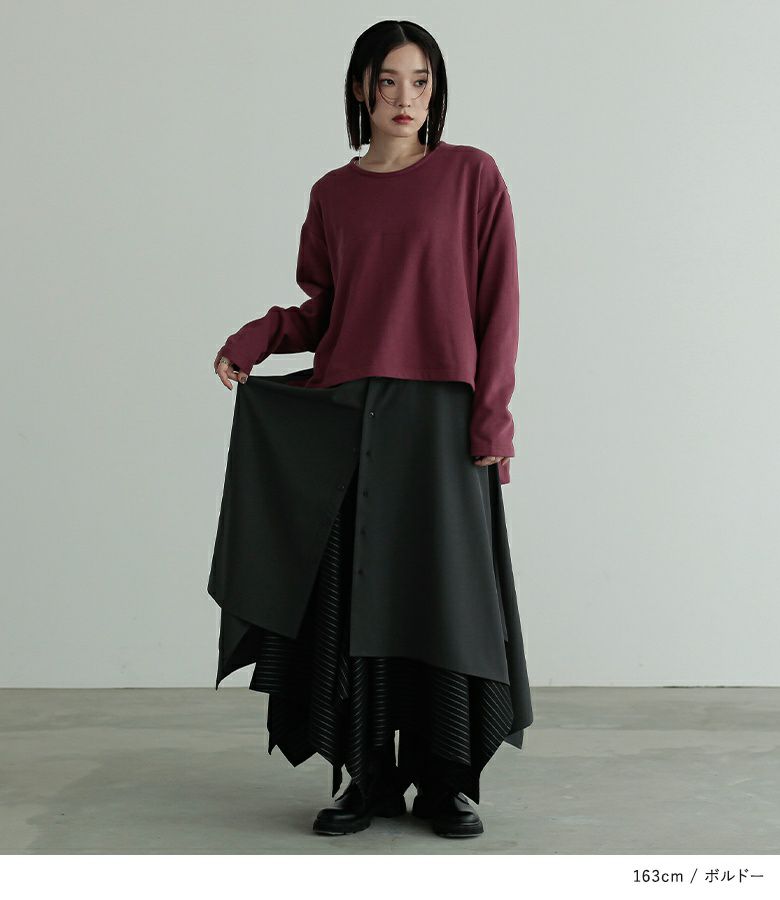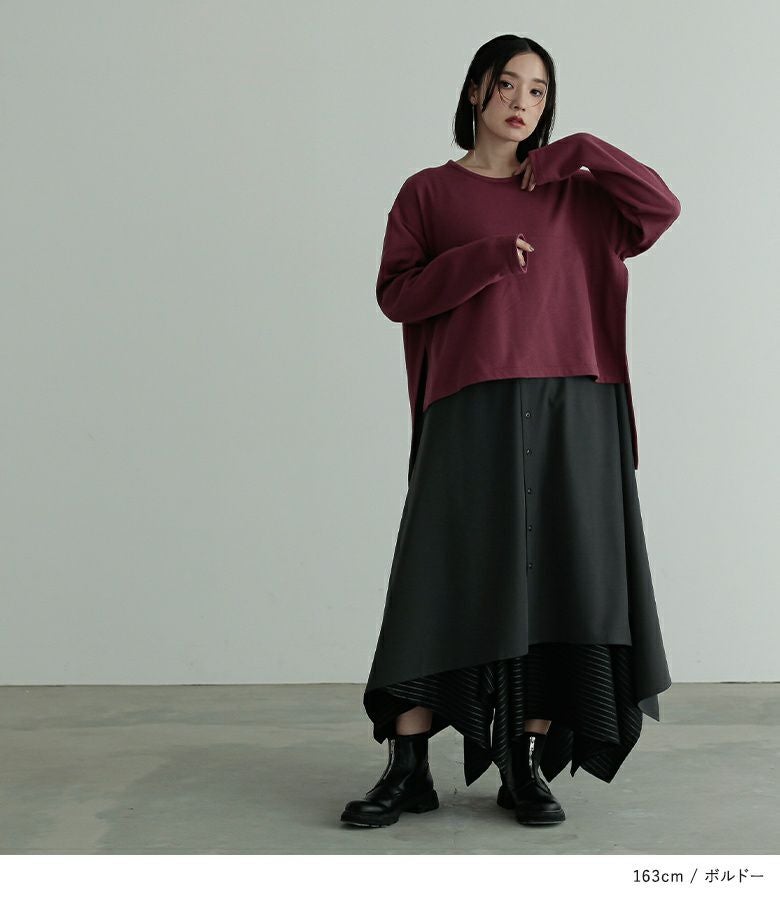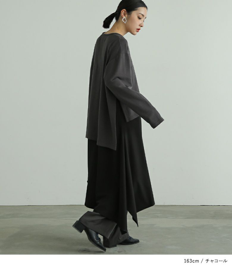 全体的に大きめで楽に着用出来ました!レイヤードデザインで一枚でお洒落見えします!