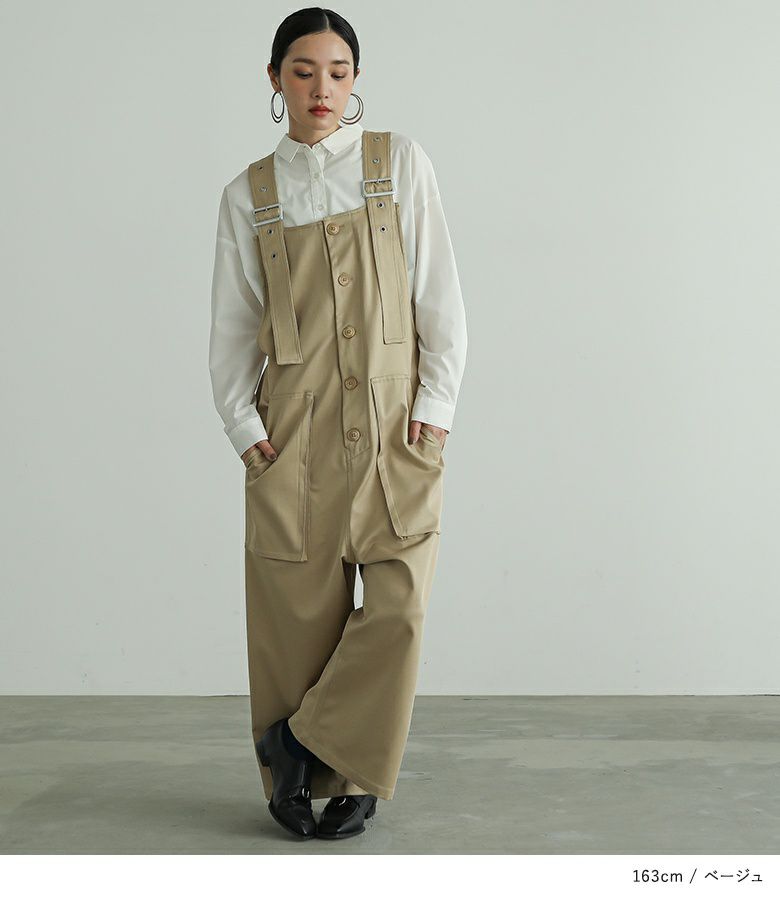 サルエルタイプに仕上げた個性的なデザインのサロペットパンツ。