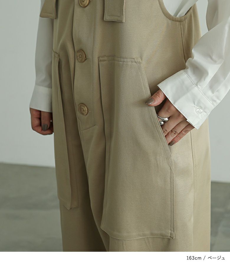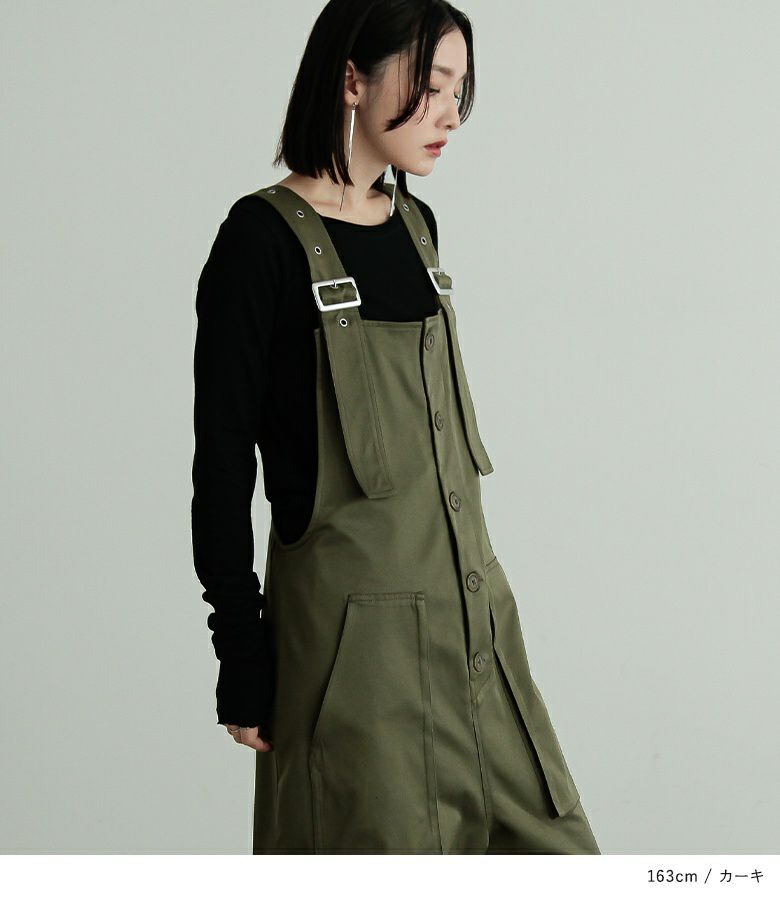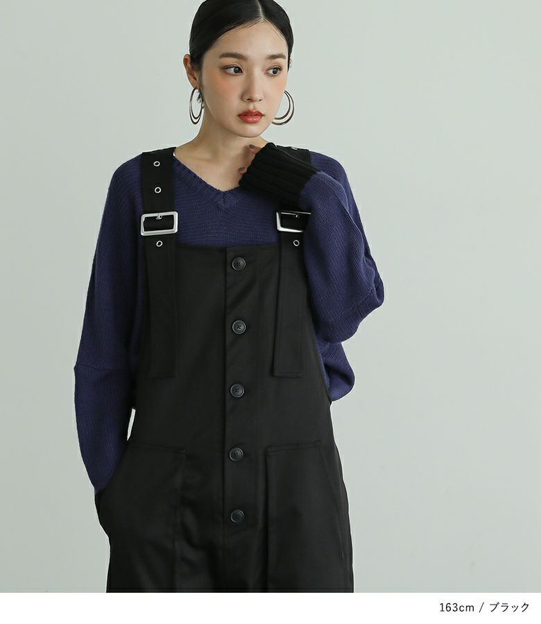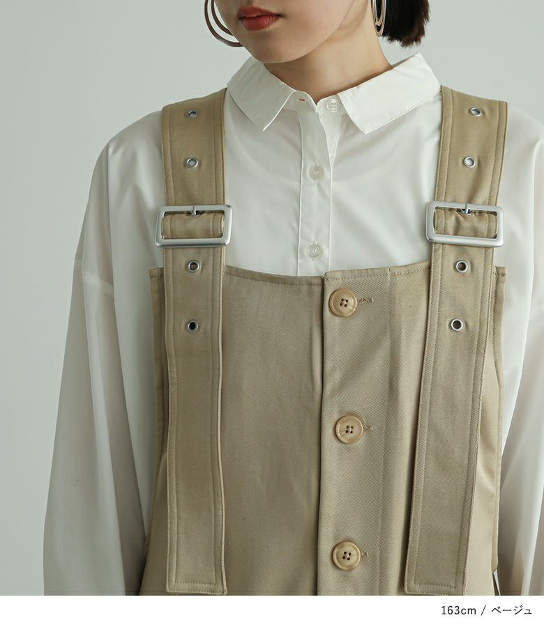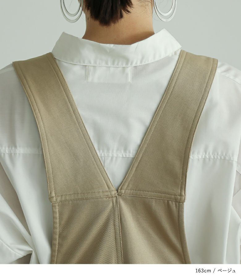 肩紐は長さを調整できるので、お好みの着丈で着られます。身幅にゆとりがあり、インナーを合わせてももたつかず、レイヤードスタイルを楽しめます。