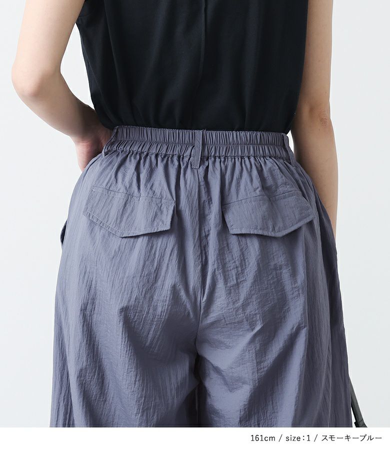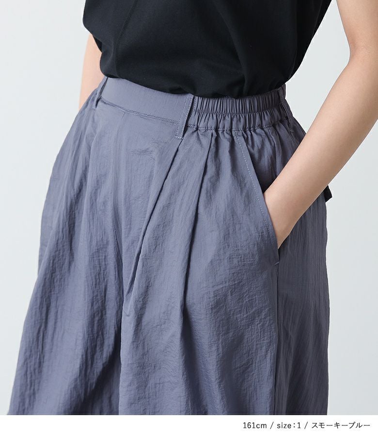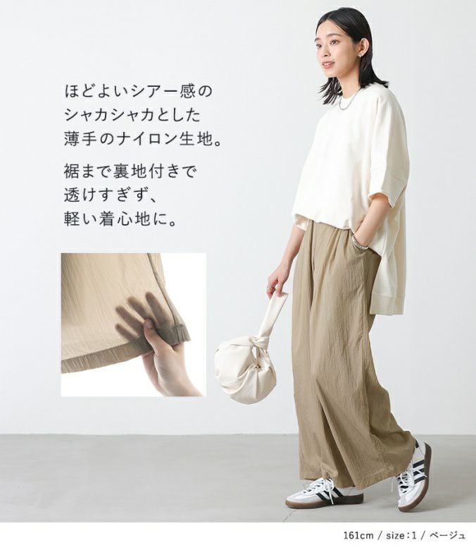 シャカシャカとした薄手のナイロン生地。柔らかく落ち感のある、軽い穿き心地の生地です。滑らかな肌触りの裏地付き。