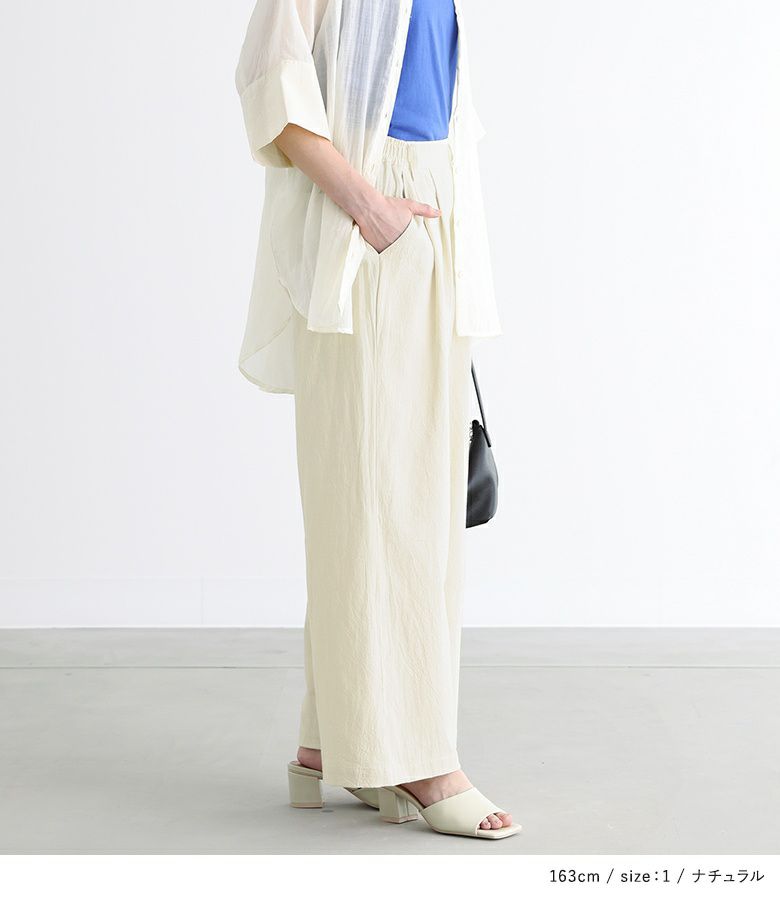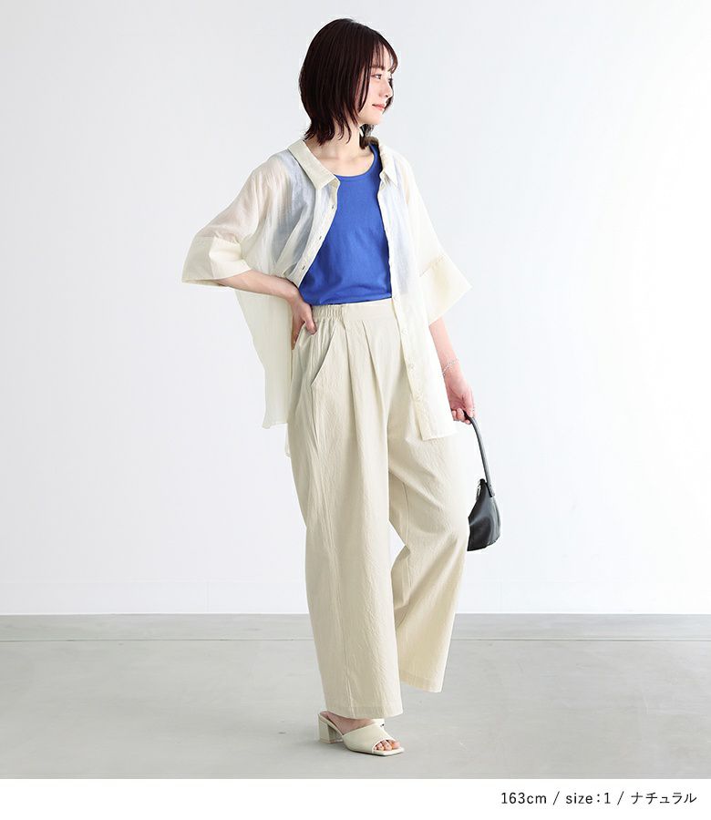 肌触りの良い、ナチュラルな風合いのコットン100%素材。涼し気なさらりとした肌触りで、春夏の着回しに活躍。