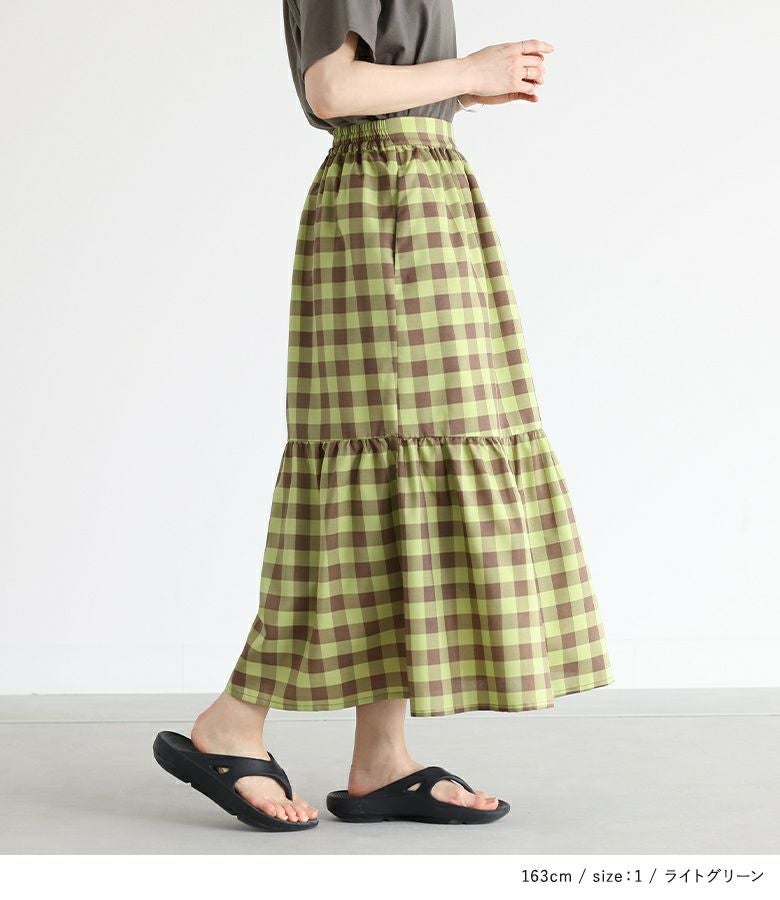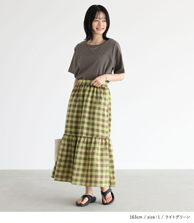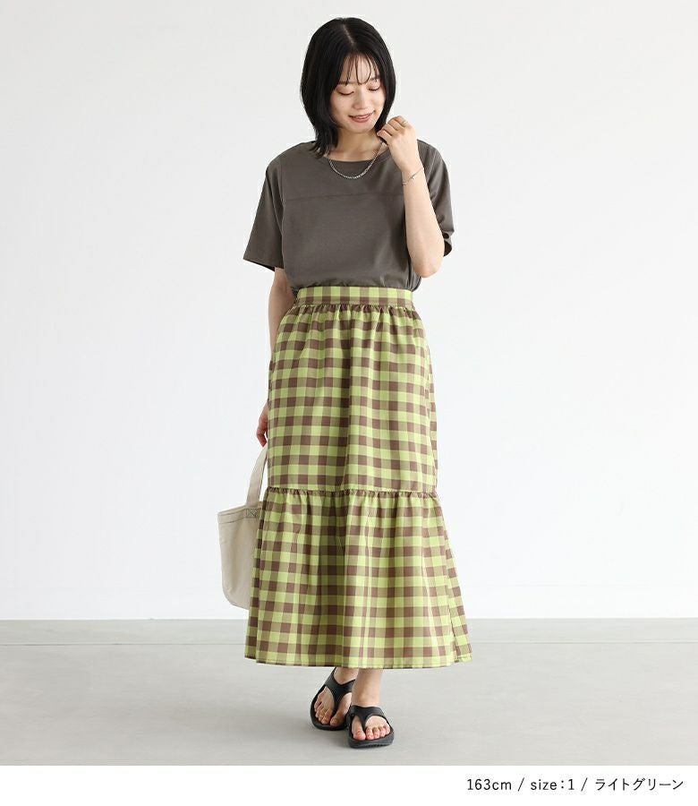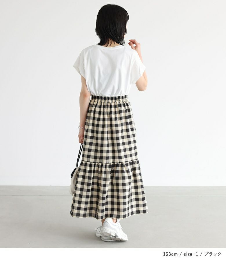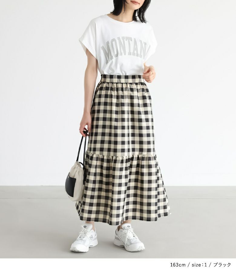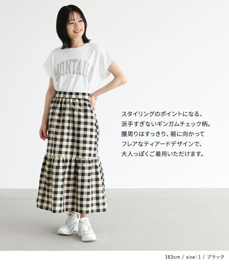 腰回りはすっきり&裾にボリュームのあるティアードデザインで、トップスをインしても、ゆるっとしたアイテムと合わせてもバランス良く着用できます。目を惹くギンガムチェック柄がコーディネートのポイントに◎