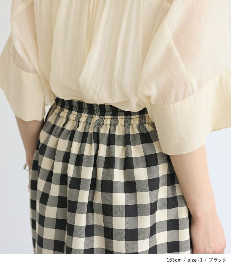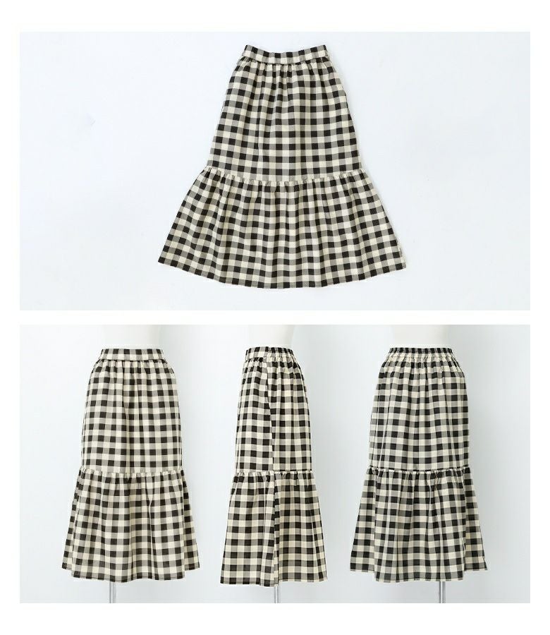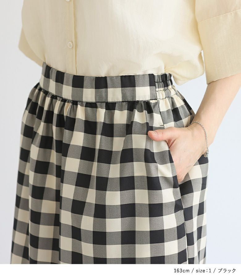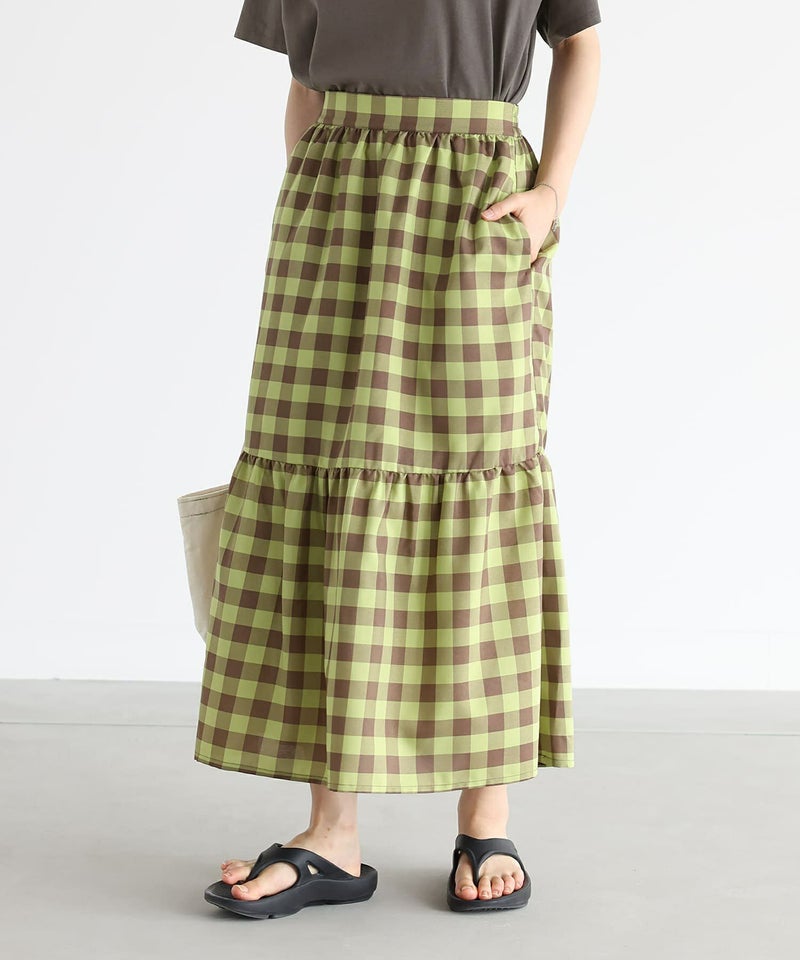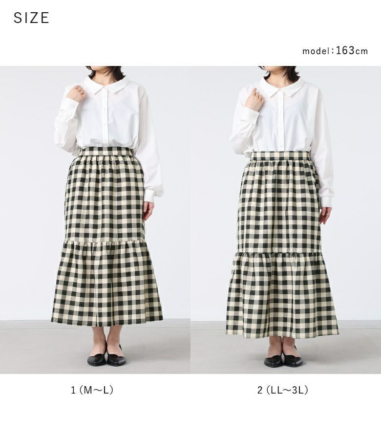 腰回りはすっきり&裾にボリュームのあるティアードデザインで、トップスをインしても、ゆるっとしたアイテムと合わせてもバランス良く着用できます。目を惹くギンガムチェック柄がコーディネートのポイントに◎