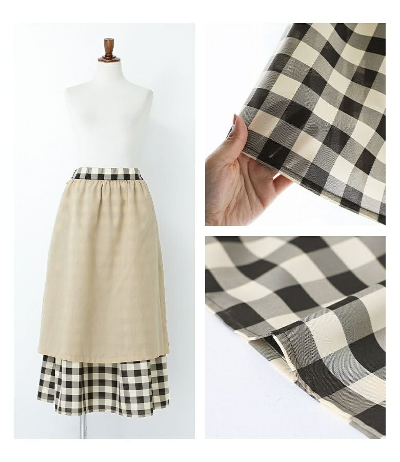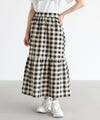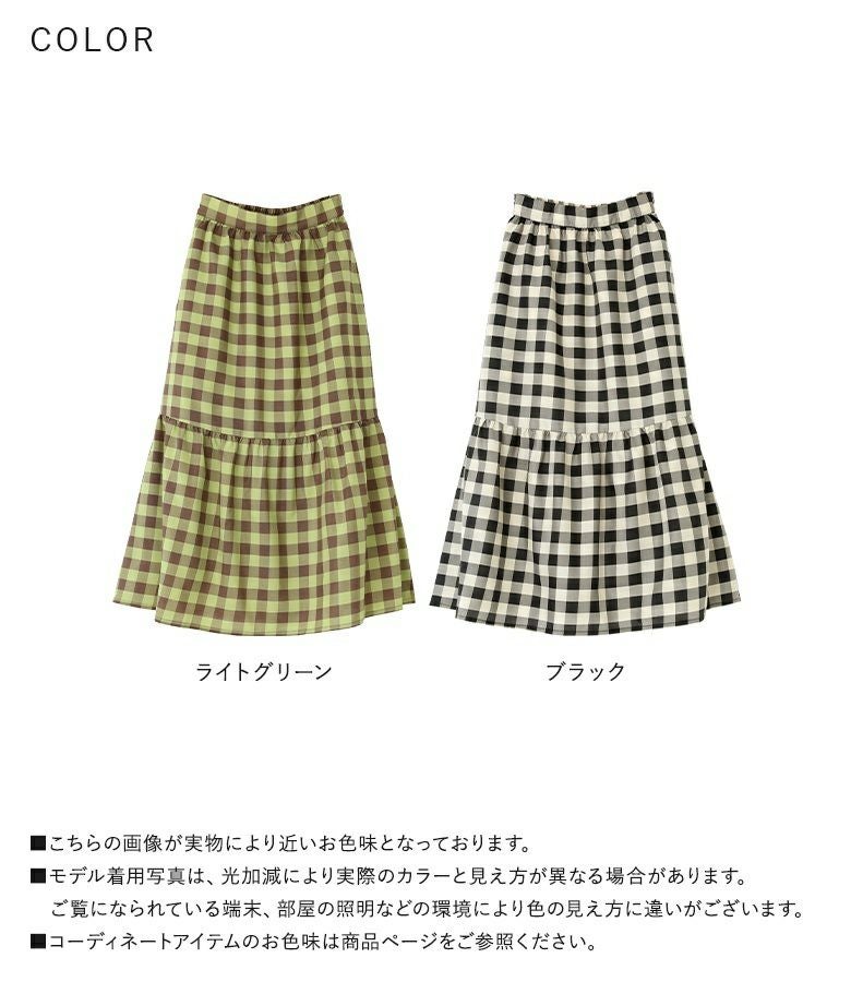 配色使いが目を惹くギンガムチェック柄のティアードスカート。前ベルト&後ろゴム仕様ですっきり見え。裏地付きで透け感を気にせずにご着用いただけます。
