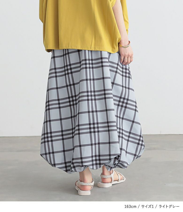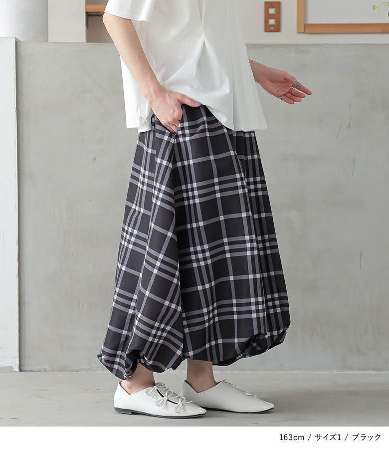 【普段着用】 Tops: M Bottoms: M/L | 【1】 着丈(ウエスト穿き):くるぶし上10cm位 ウエスト:ややゆったり ヒップ:ゆったり 太もも周り:ゆったり 全体:ゆったり