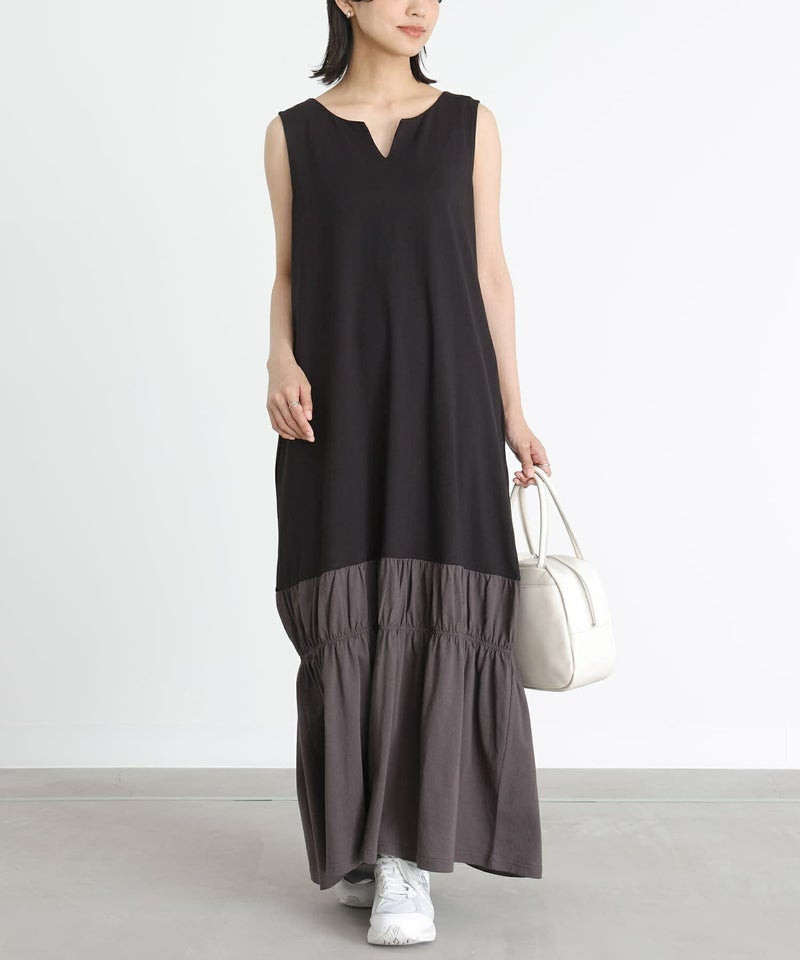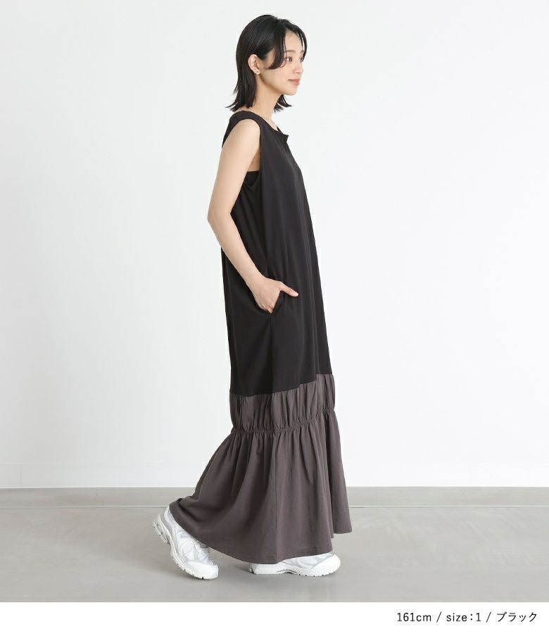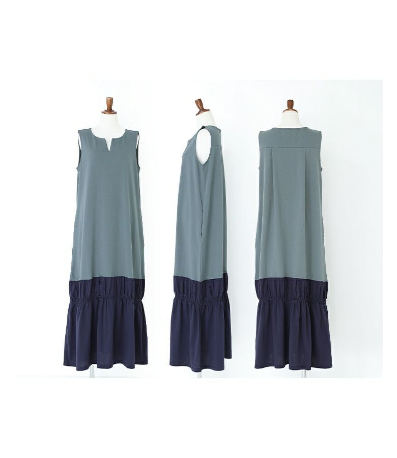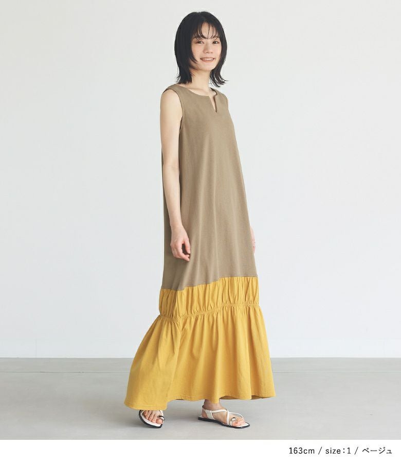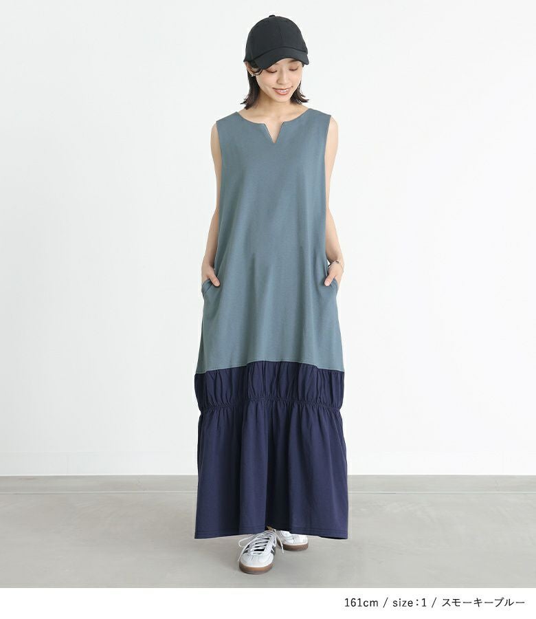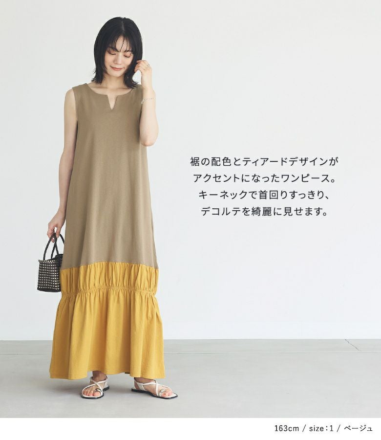 配色デザインが目を惹く、一枚で着用してもお洒落見えするティアードワンピース。キーネックで首元をすっきりと見せます。スカート部分にはゴムギャザーを入れて広がり過ぎず、動きやすいデザインにしました。シームポケット付き&ファスナーなしで楽に着脱できる仕様です。