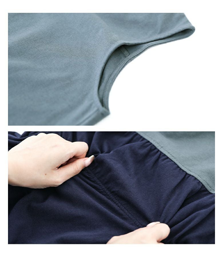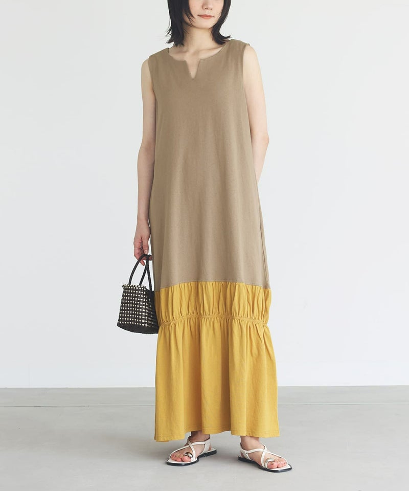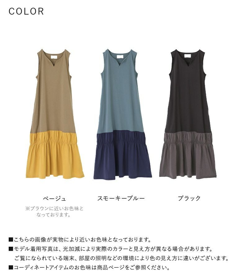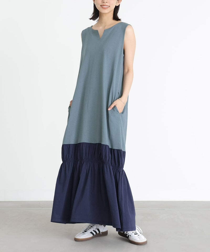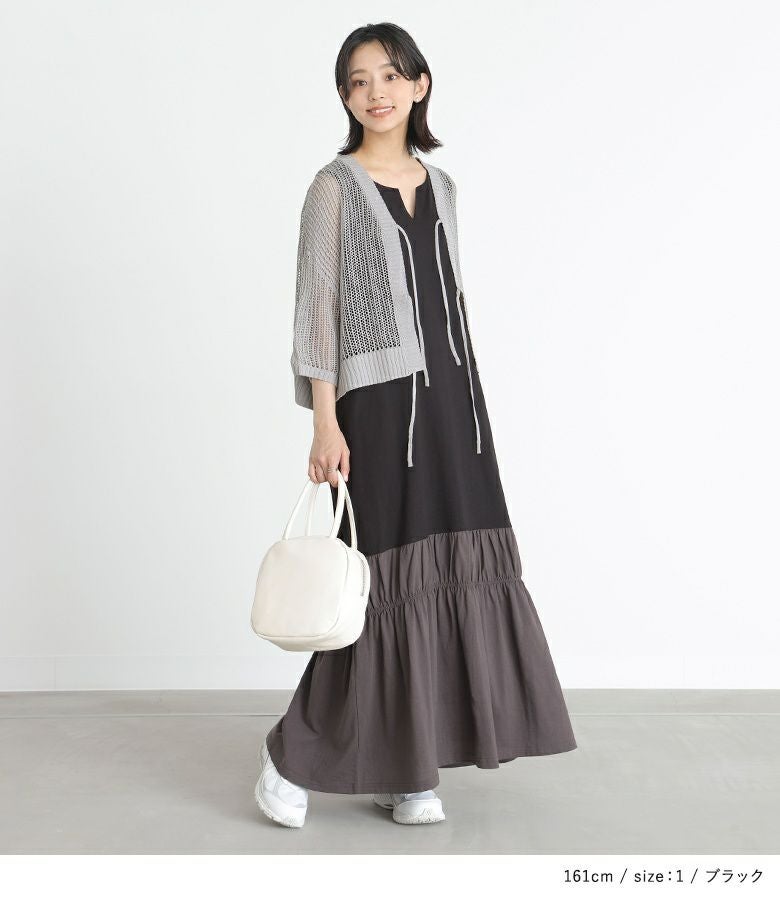 配色デザインが目を惹く、一枚で着用してもお洒落見えするティアードワンピース。キーネックで首元をすっきりと見せます。スカート部分にはゴムギャザーを入れて広がり過ぎず、動きやすいデザインにしました。シームポケット付き&ファスナーなしで楽に着脱できる仕様です。
