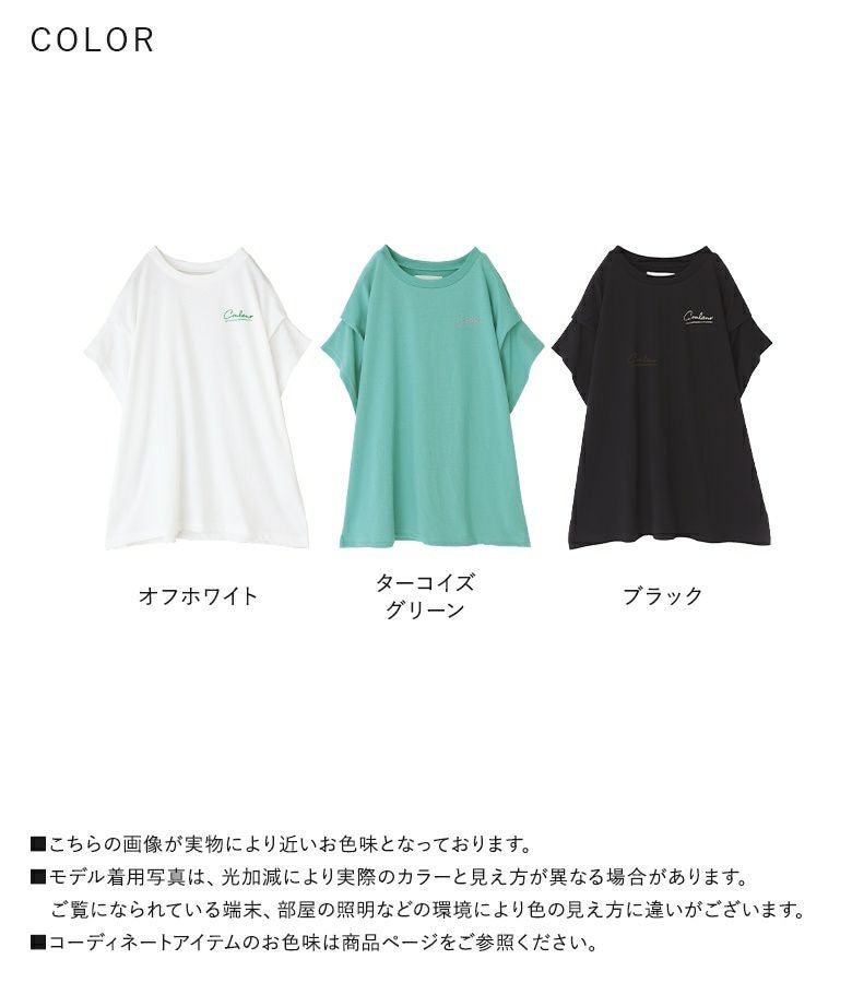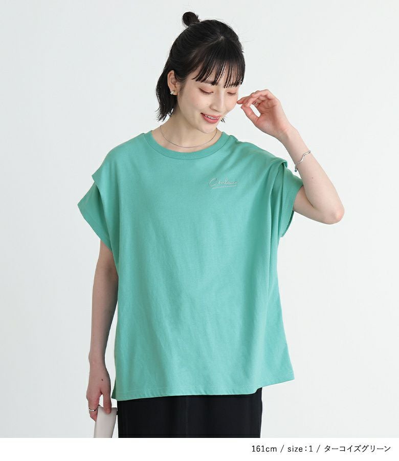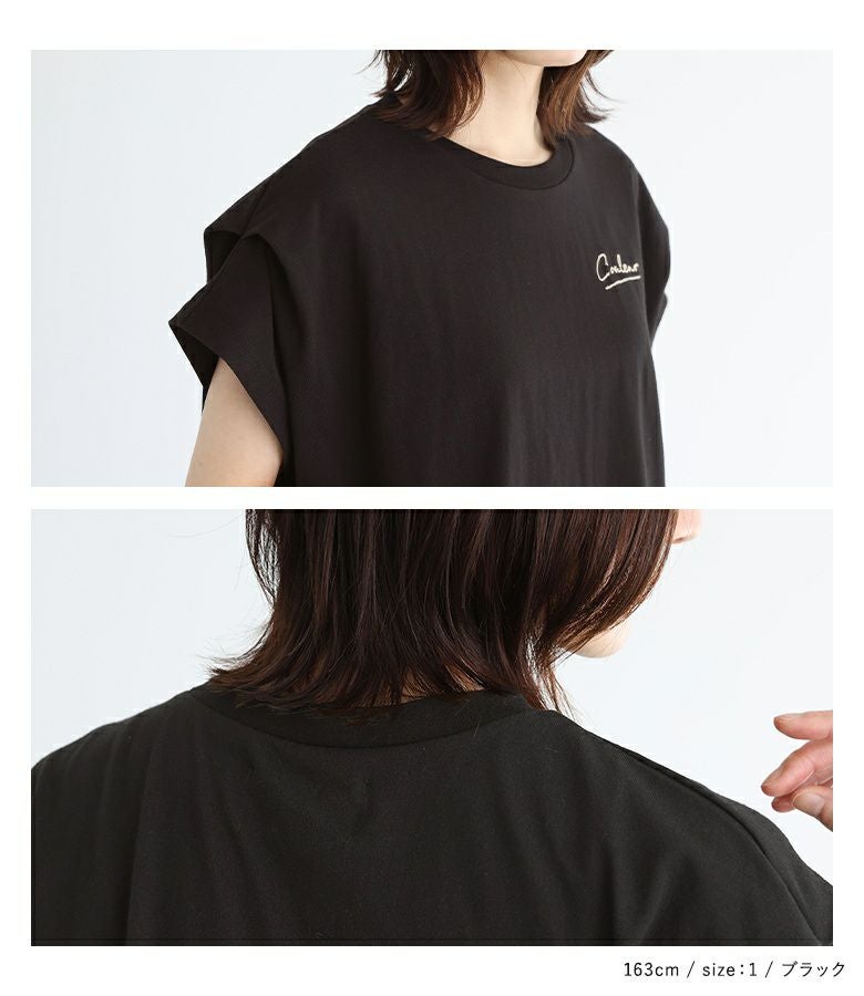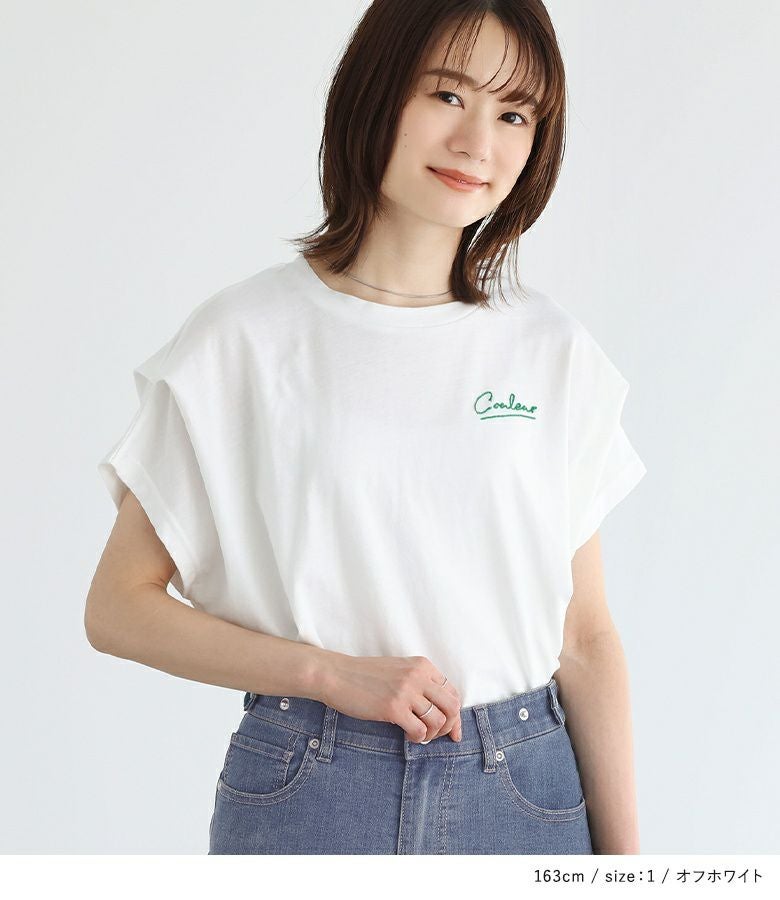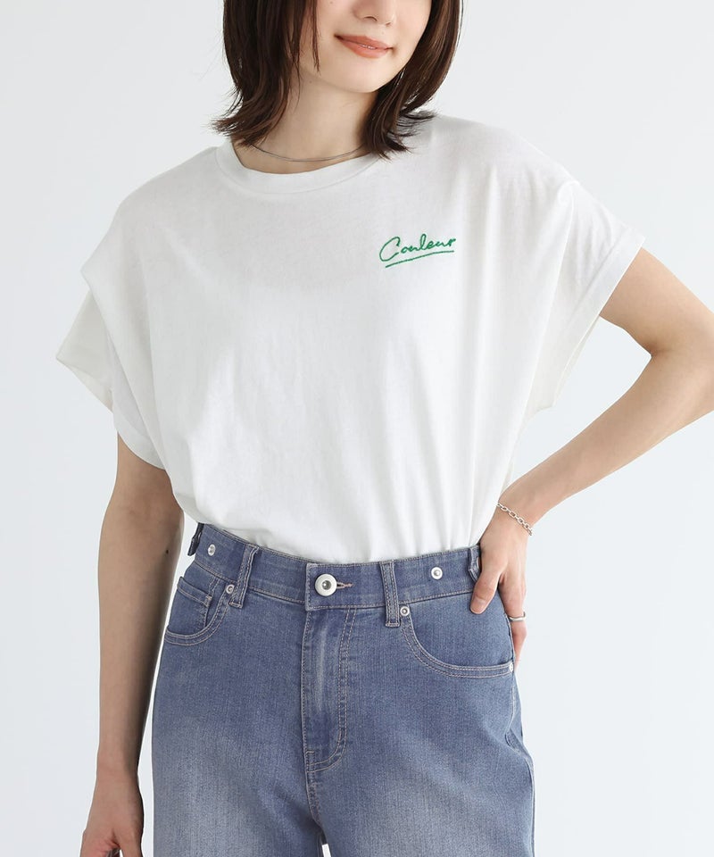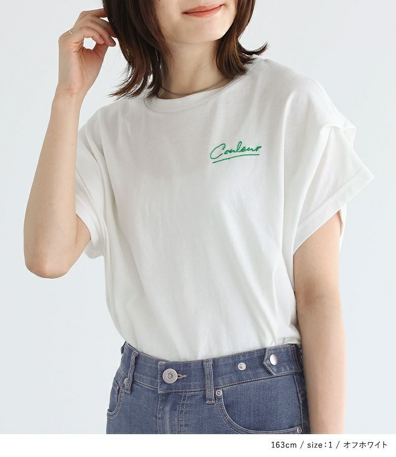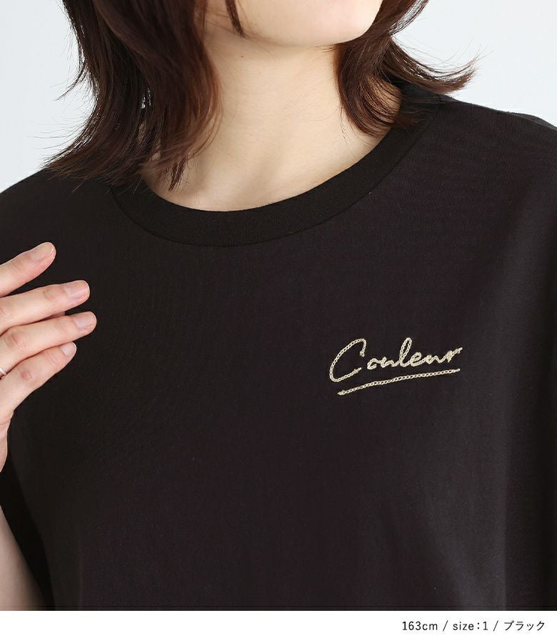胸元にあしらった、身頃と配色のチェーンステッチ刺繍がさりげないワンポイントになったロゴTシャツ。袖にタックを入れて身頃に張り付かず、ゆるっとラフに着用できるデザインです。