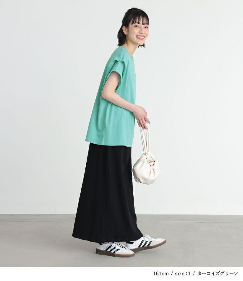 ゆるっとしたシルエットでカジュアルに着用できました。袖のタックが入っているので、二の腕がスッキリと綺麗に見えました。