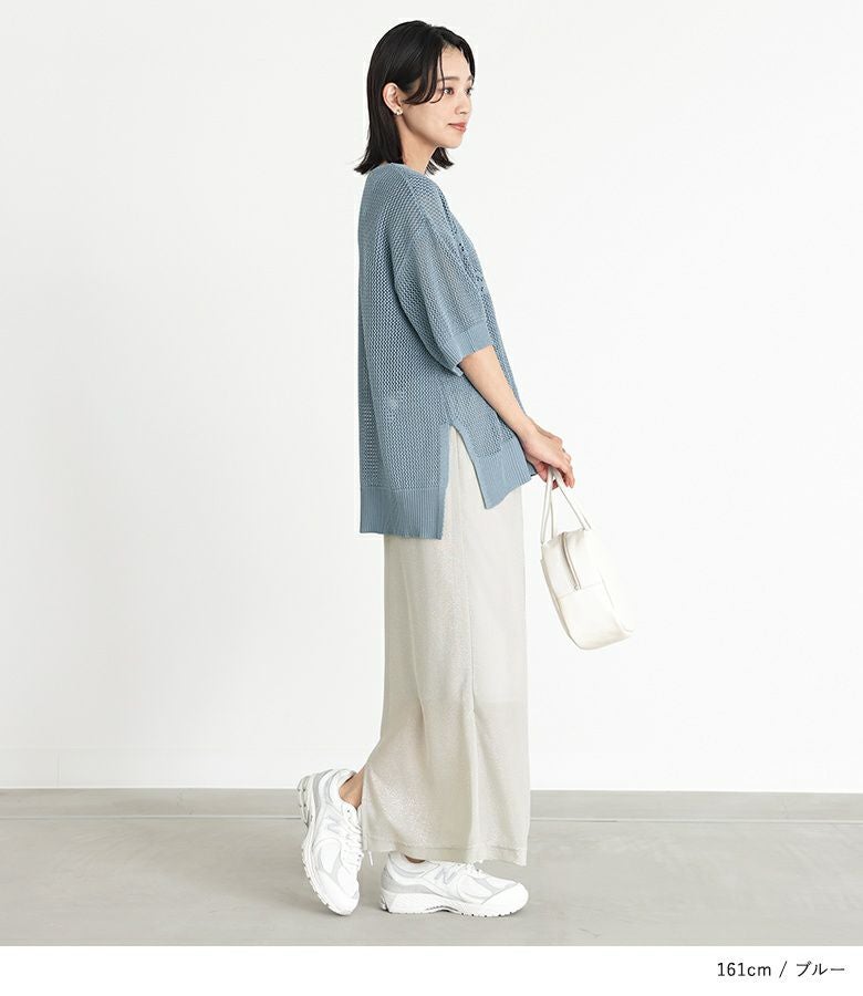 両脇にスリットが入っているので、パンツでもスカートでも合わせやすそうです。