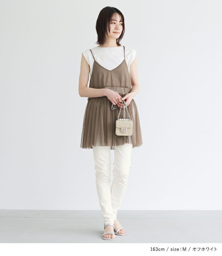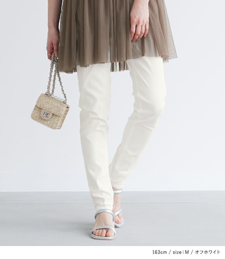 シンプルなデザインで着回しやすく、そのままトップスと合わせるスタイルはもちろん、ワンピースとのレイヤードスタイルもおすすめです。豊富なサイズ展開で、ちょうどいいサイズ感ですっきりと着用するほか、あえてやや大きめのサイズでゆるっとしたシルエットを楽しんでもいただけます。