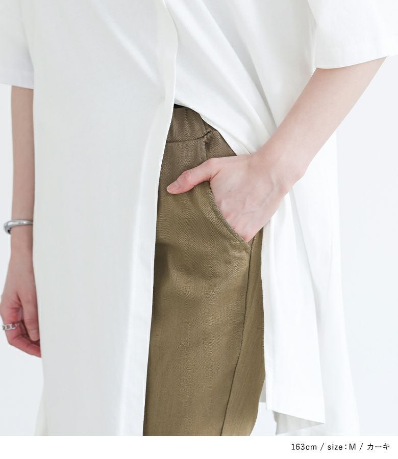 暑い日でも快適に穿ける、ひんやり冷感のツイルレギパン。細かくパターンを調整した、こだわりのシルエットです。後ろにパッチポケットを付けることでよりパンツらしいデザインに。大きさや形、配置にこだわり、ヒップラインを綺麗にカバーします。裾をロールアップさせてもくしゅっとさせても着用できる、程良い丈感です。