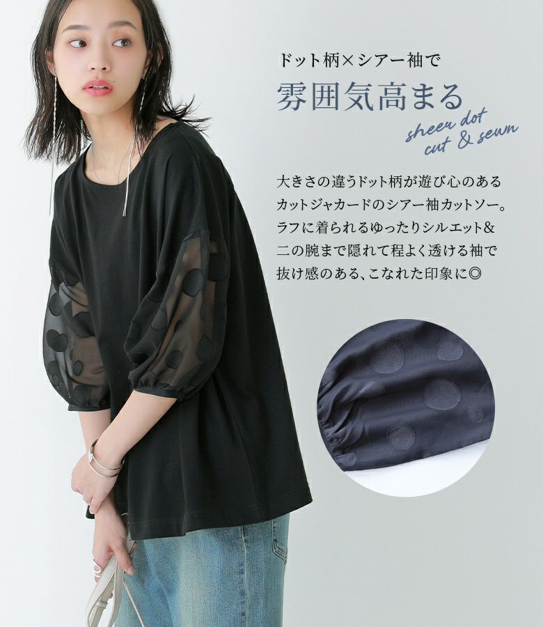 大きさの違うドット柄が遊び心のある、カットジャカードのシアー袖カットソー。ラフに着られるゆったりシルエット&二の腕まで隠れて程よく透ける袖が、抜け感のあるこなれた印象に導きます。