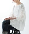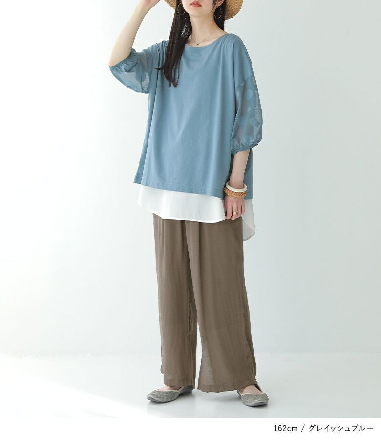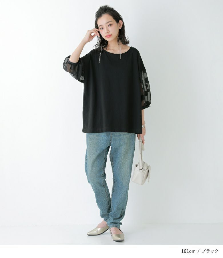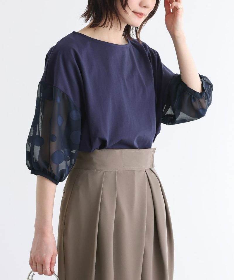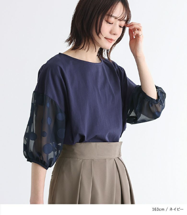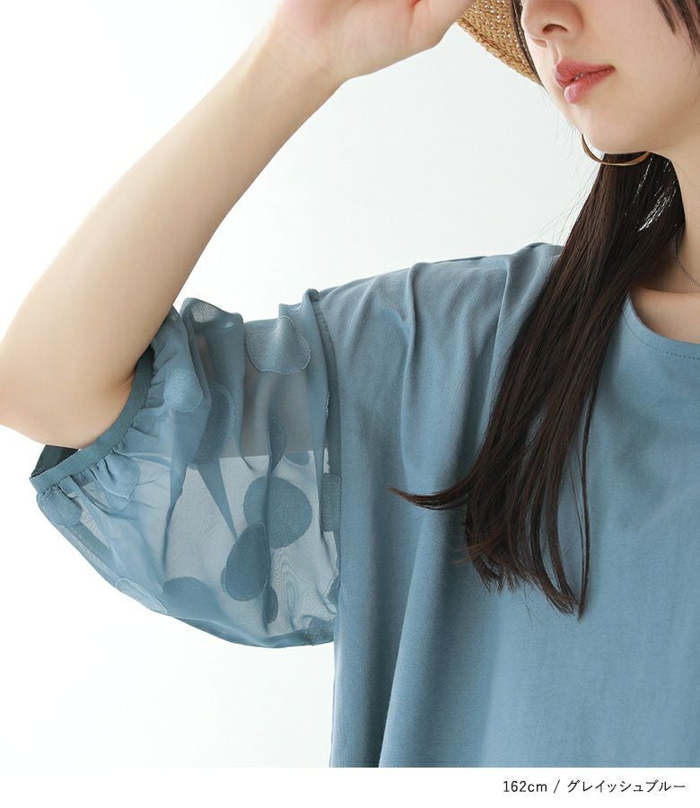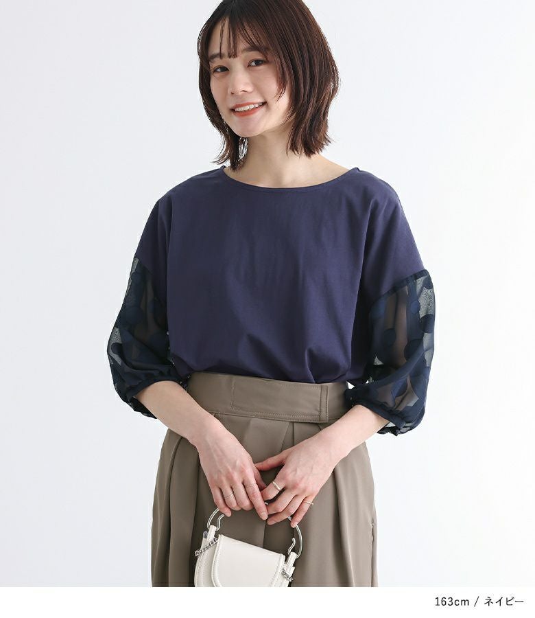 身生地はコットン100%の天竺編みカットソーで、肌触り抜群なさらりと着やすい生地。シアー袖はカットジャカードを使用。これからの季節に着回したい素材感です。