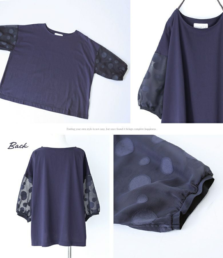 ゆったり着れるんだけど首もとは開きすぎてなくて私的には好きな型です。袖の透け感と水玉模様がシックだけど可愛いです。セール中だったので黒と白を買いました。とても良い買い物ができました(^-^)