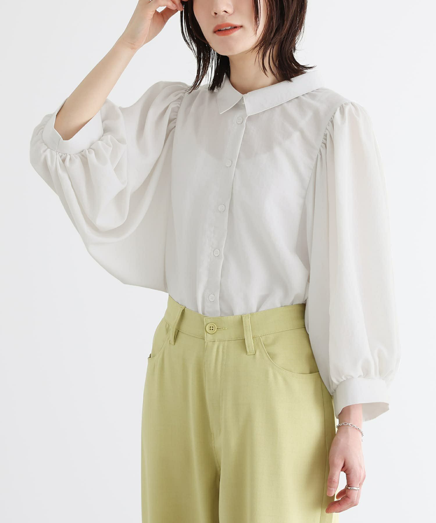 パフスリーブがポイントになったブラウス。袖山と袖口に細かくたっぷりとギャザーを入れ、ボリューム感を出しました。袖幅が広く、腕をあげた時にボリュームのあるドルマンシルエット。首元はすっきり見えするシャツカラーに、裾はカーブラインで柔らかい印象に仕上げました。