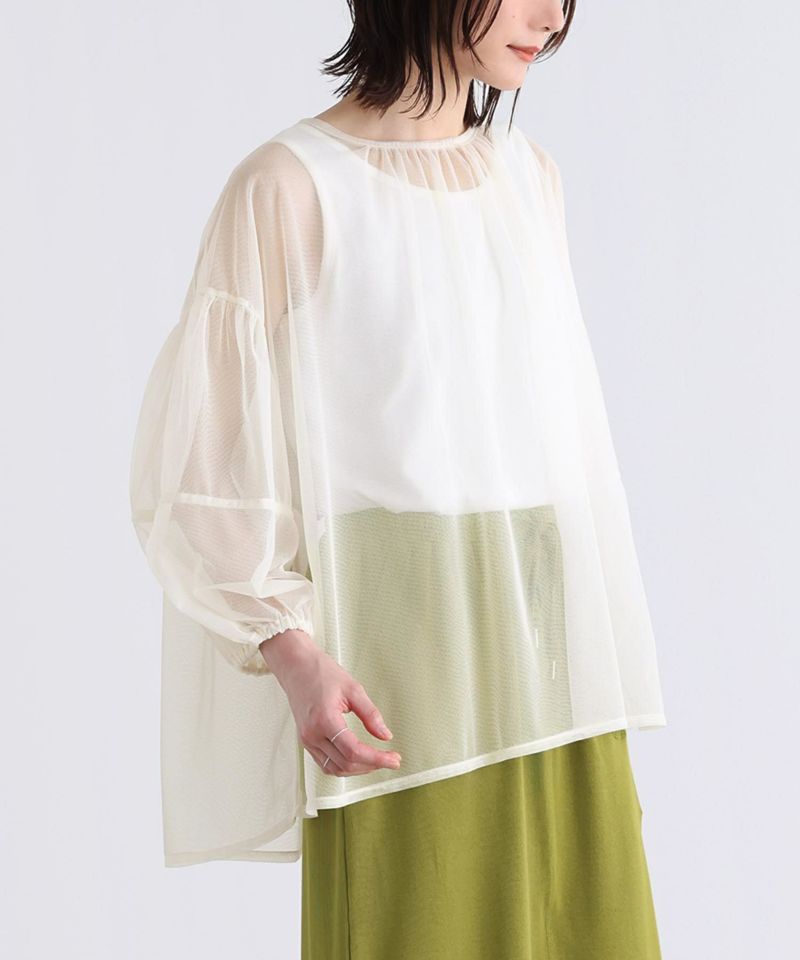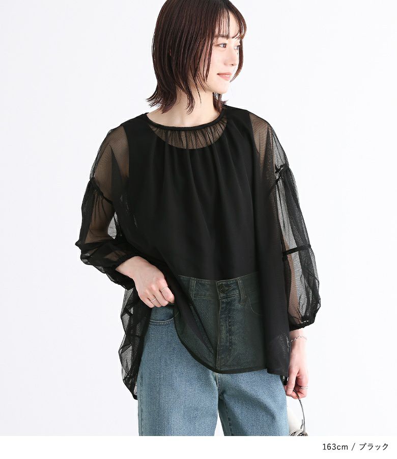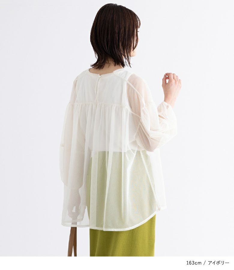 透け感のある二層仕立てのチュールが、繊細なシアー感を演出するトップス。立体的なボリュームのあるランタンスリーブがポイントになります。身頃や袖に入ったギャザーで、女性らしく表情豊かな印象に導きます。