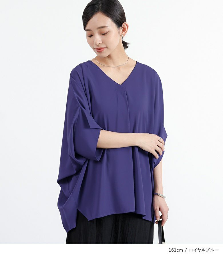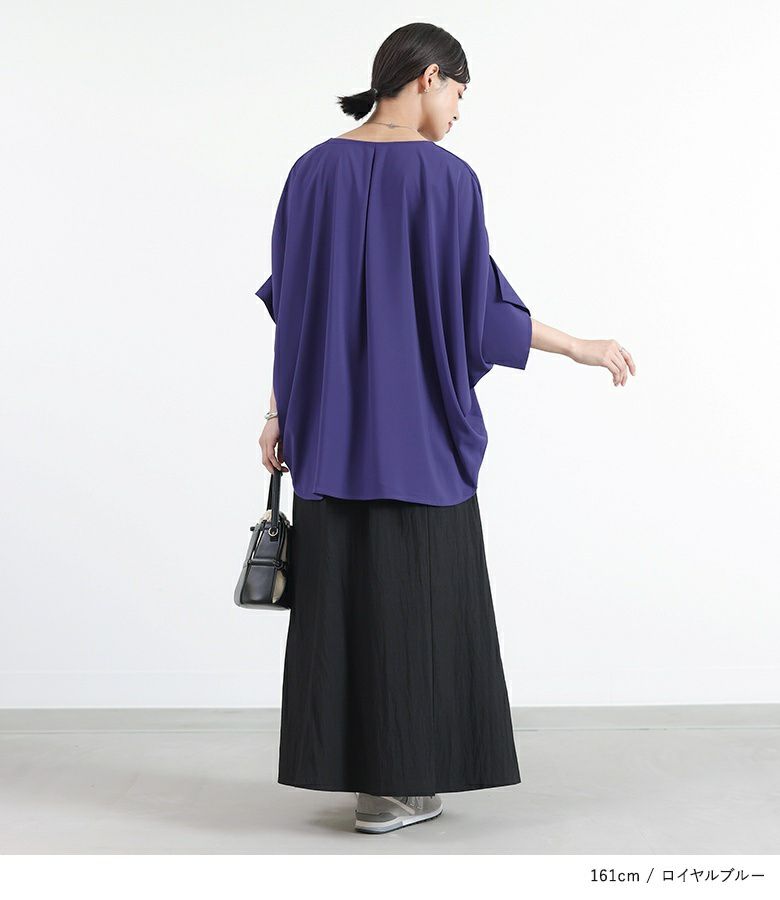 袖を上に上げたようなバンザイシルエットが特徴のシャツ。落ち感のある素材で、サイドに独特なドレープを作ります。すっきり見えするVネックとタックデザインでシャープな印象。センターフロントにもボックスタックを採用し、のっぺりと見えないようにしました。前後差のある着丈でお尻回りをカバー、スラッシュ開きで前タックインもしやすく、抜け感のあるデザインです。