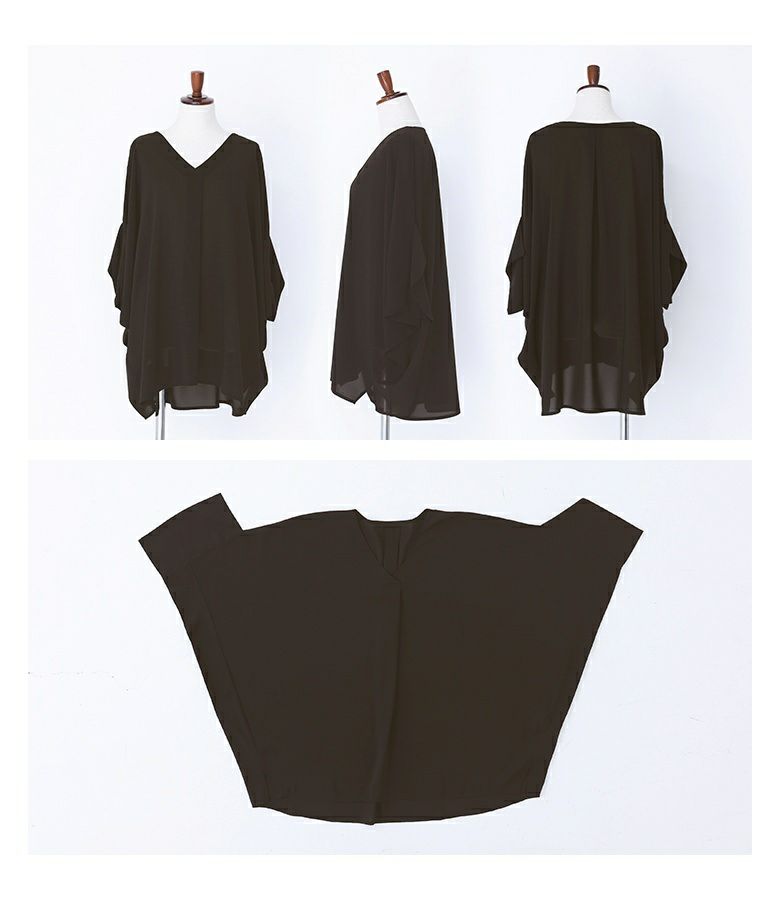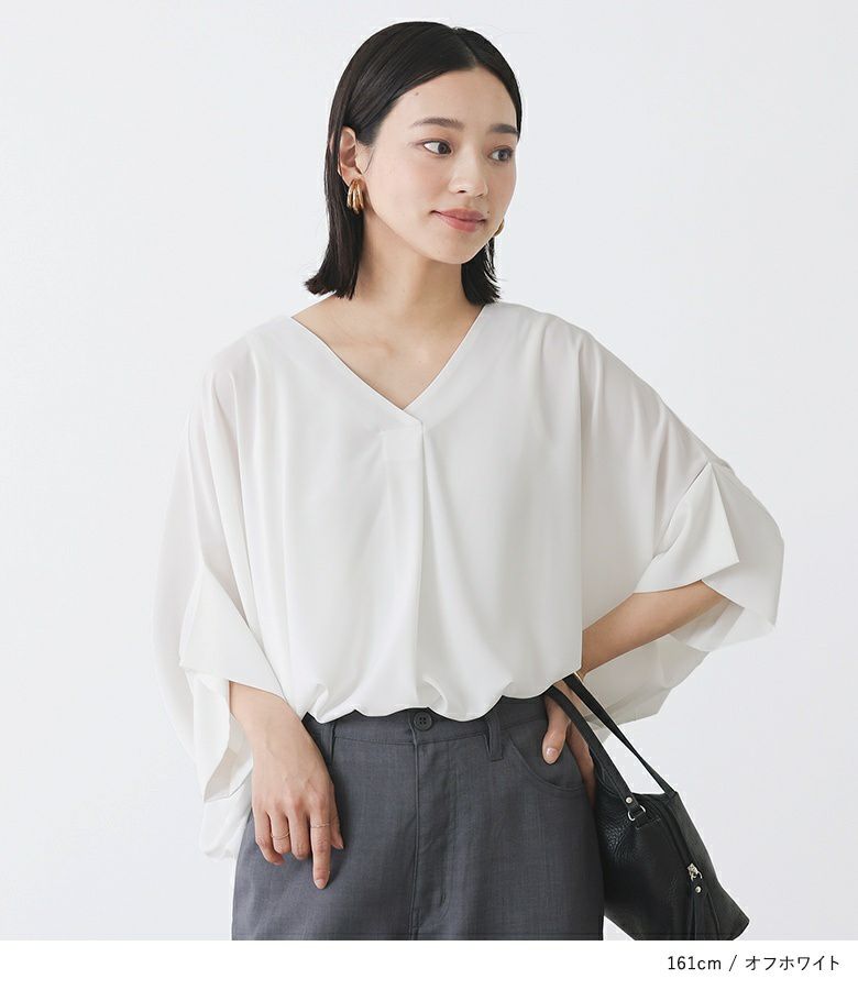 ブラック、オフホワイト購入 落ち感のある生地でシルエットが可愛いです 袖も二の腕をカバーできる長さがあります 薄手ですがそこまで透けません シンプルなデザインで使い回しできます