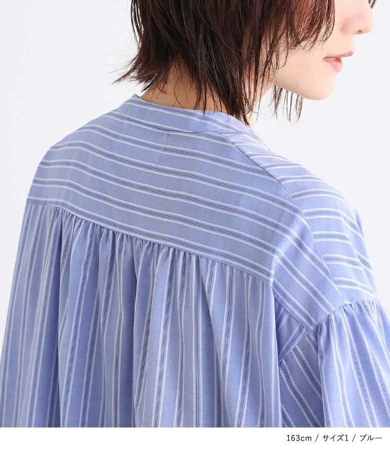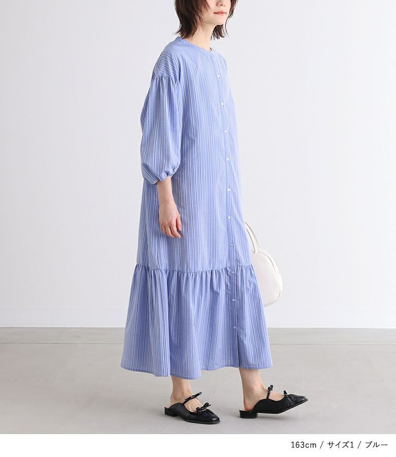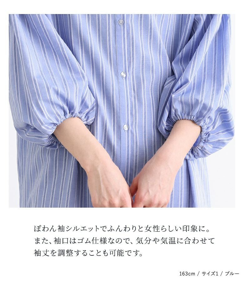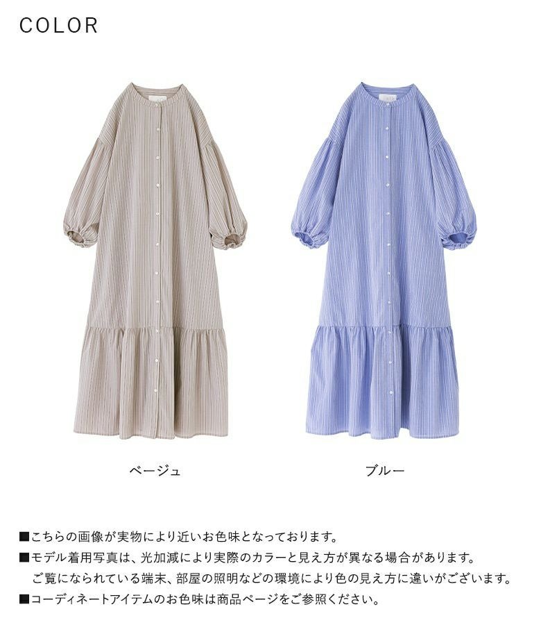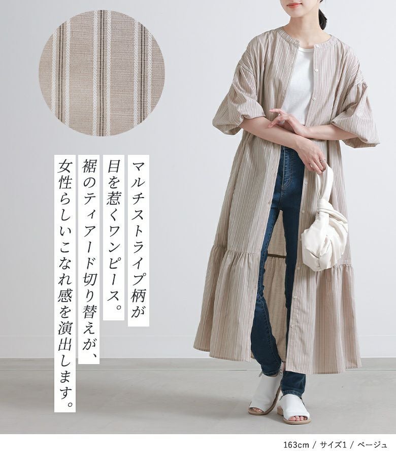裾のティアード切り替えがポイントになった、マルチストライプ柄のシャツワンピース。袖の後ろを長めにしてギャザーを入れたぽわん袖が、大人っぽくこなれた印象に導きます。便利な両サイドポケットも嬉しい仕様◎