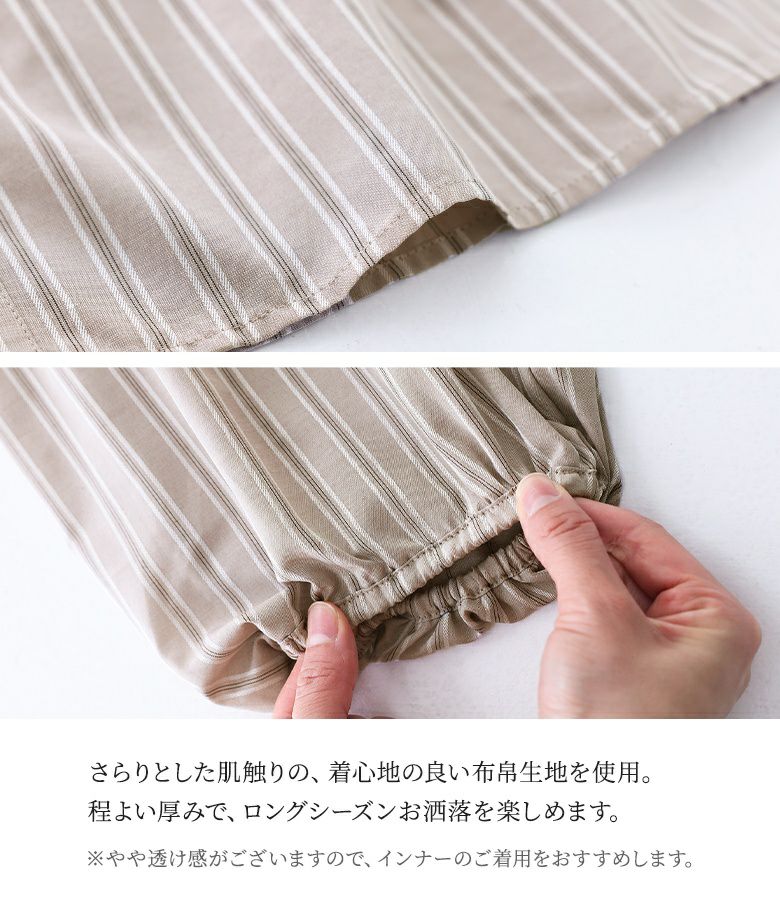 さらりとした肌触りの、着心地の良い布帛生地。程よい厚みでロングシーズンお洒落を楽しめます。