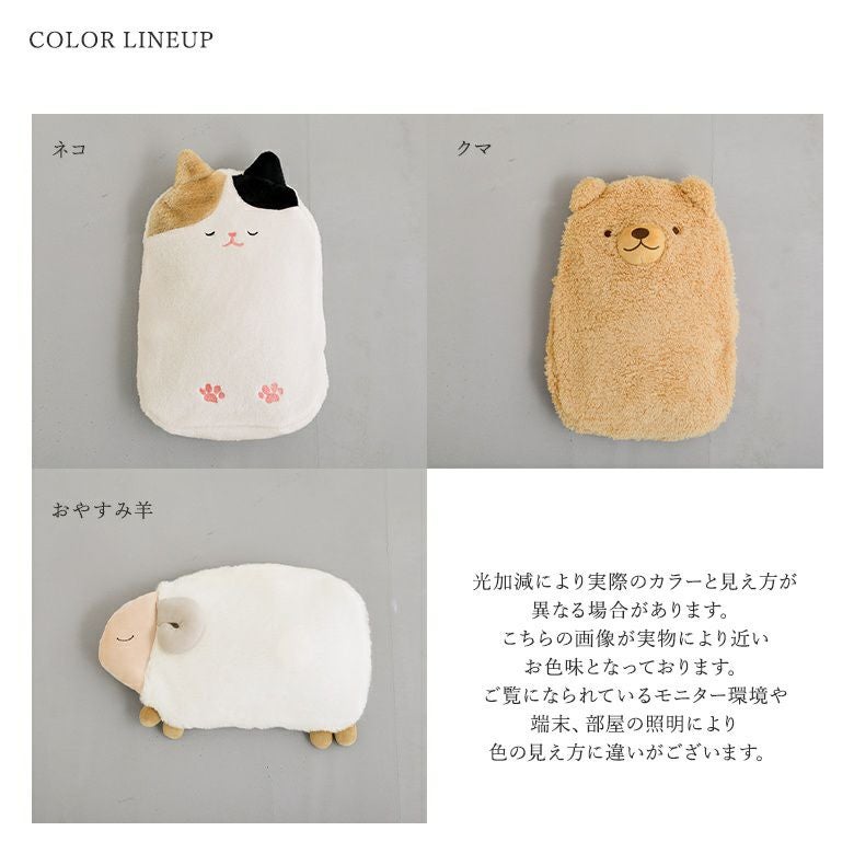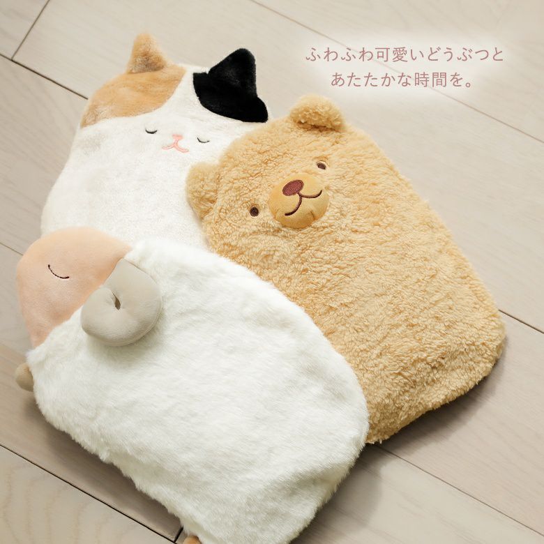 素材【カバー素材(ネコ)】表地:ポリエステル100% 【カバー素材(クマ)】表地:ポリエステル100% 詰物:わた(ポリエステル100%) 【カバー素材(羊)】胴体部分:ポリエステル100% 耳・足部分:ポリエステル95% ポリウレタン5% 詰物:わた(ポリエステル100%) 本体内側素材:PVC 本体外側素材:ポリエステル 蓄熱材主成分:チオ硫酸ナトリウム