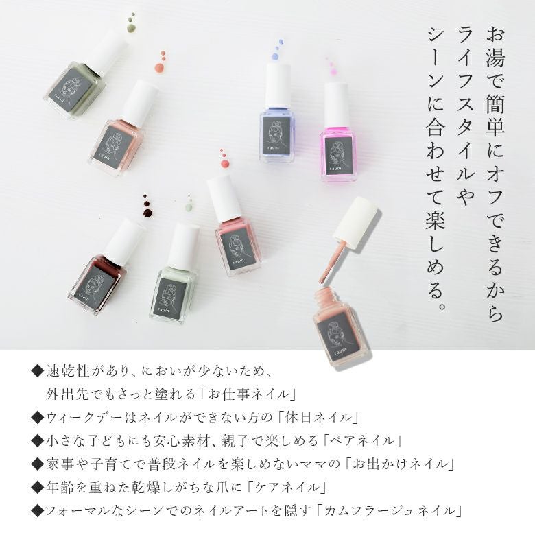 お湯で簡単にオフできるからライフスタイルやシーンに合わせて楽しめる。