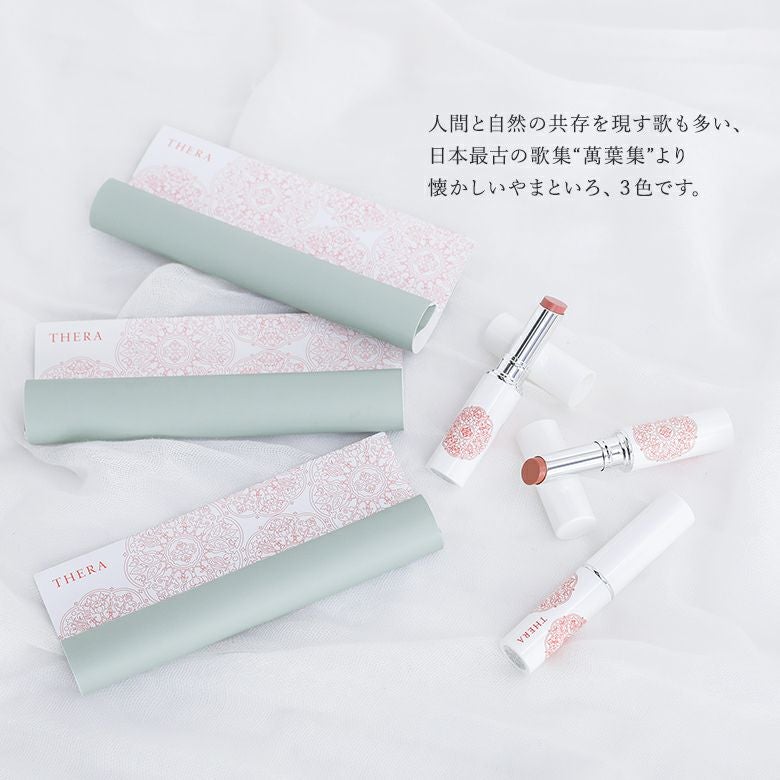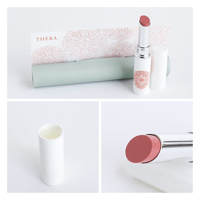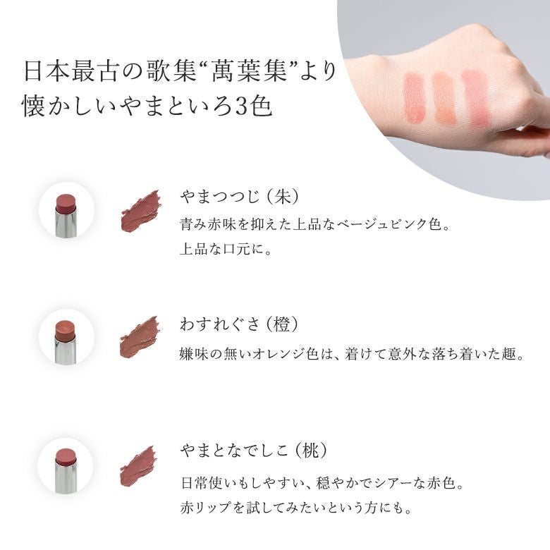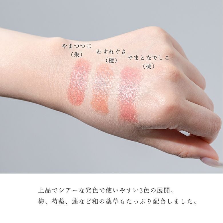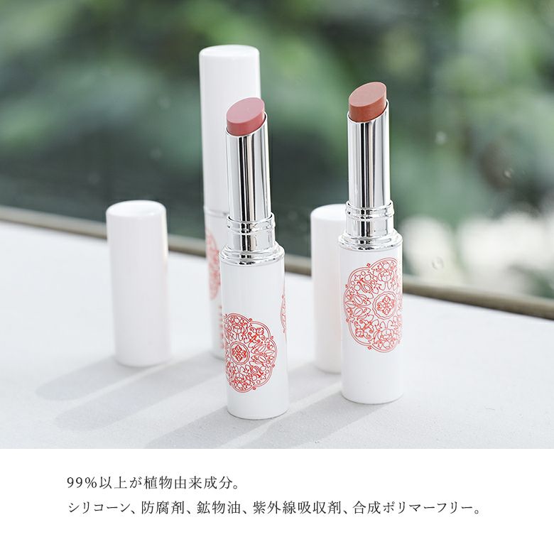 素材表記ジイソステアリン酸ダイマージリノレイル、ステアロイルオキシステアリン酸オクチルドデシル、ダイマージリノール酸水添ヒマシ油、ダイマージリノール酸ジ(イソステアリル/フィトステリル)、キャンデリラロウ、ミリスチン酸オクチルドデシル、ミツロウ、ホホバエステル、カルナウバロウ、スクワラン、ツバキ種子油、ウメ果実エキス、ヨモギ葉エキス、シャクヤク根エキス、アシタバ葉/茎エキス、チャ葉エキス、トコフェロール、BG、水(+/-)酸化チタン、酸化鉄、カルミン、グンジョウ、水酸化AI、ステアリン酸