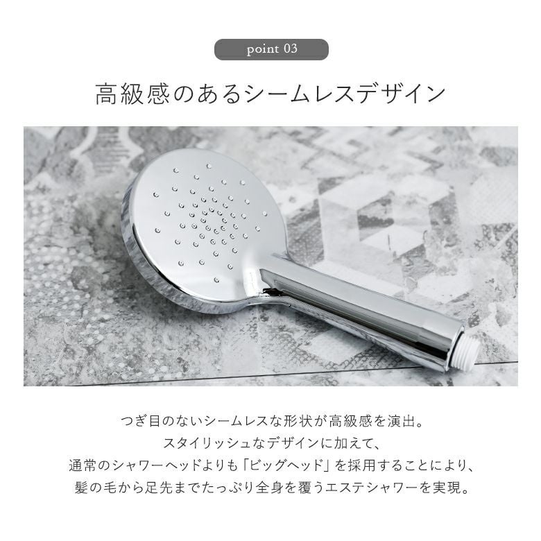 つぎ目のないシームレスな形状が高級感を演出。スタイリッシュなデザインに加えて、通常のシャワーヘッドよりも「ビッグヘッド」を採用することにより、髪の毛から足先まで全身を覆うエステシャワーを実現。