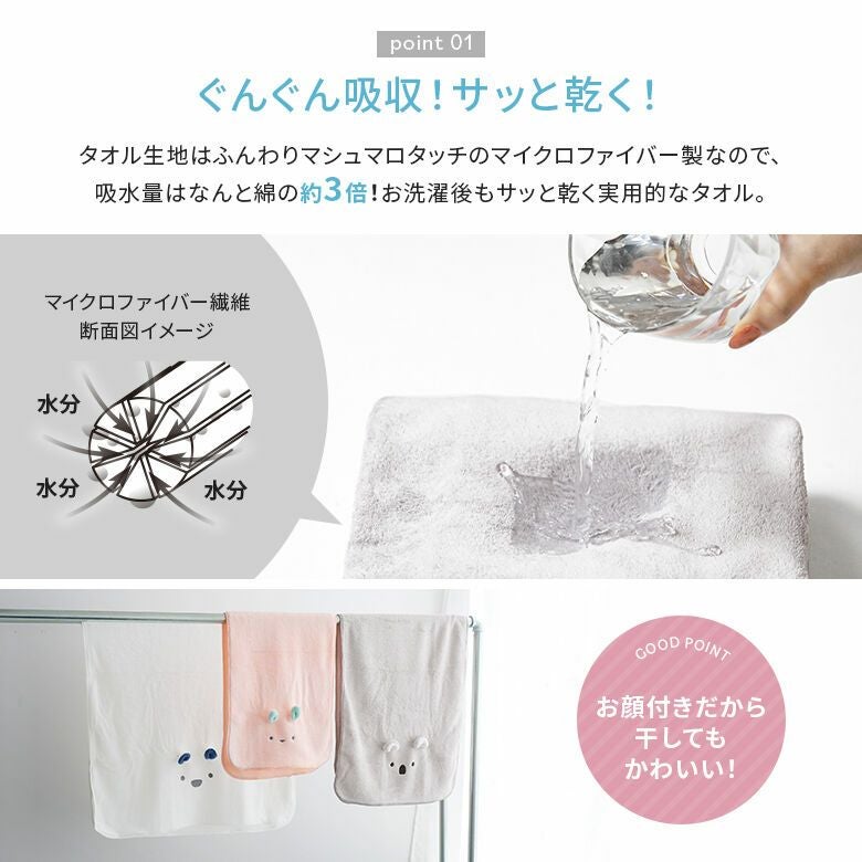 タオル生地はふんわりマシュマロタッチのマイクロファイバー製なので、吸水量はなんと綿の約3倍!お洗濯後もサッと乾く実用的なタオルです。