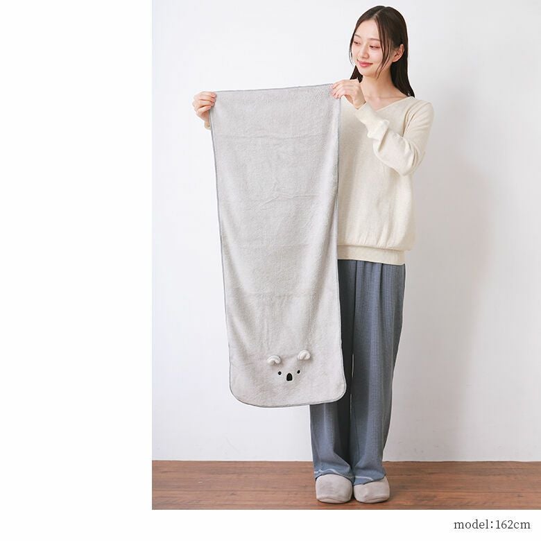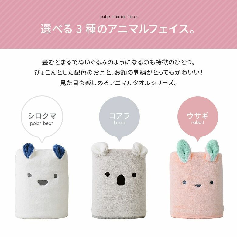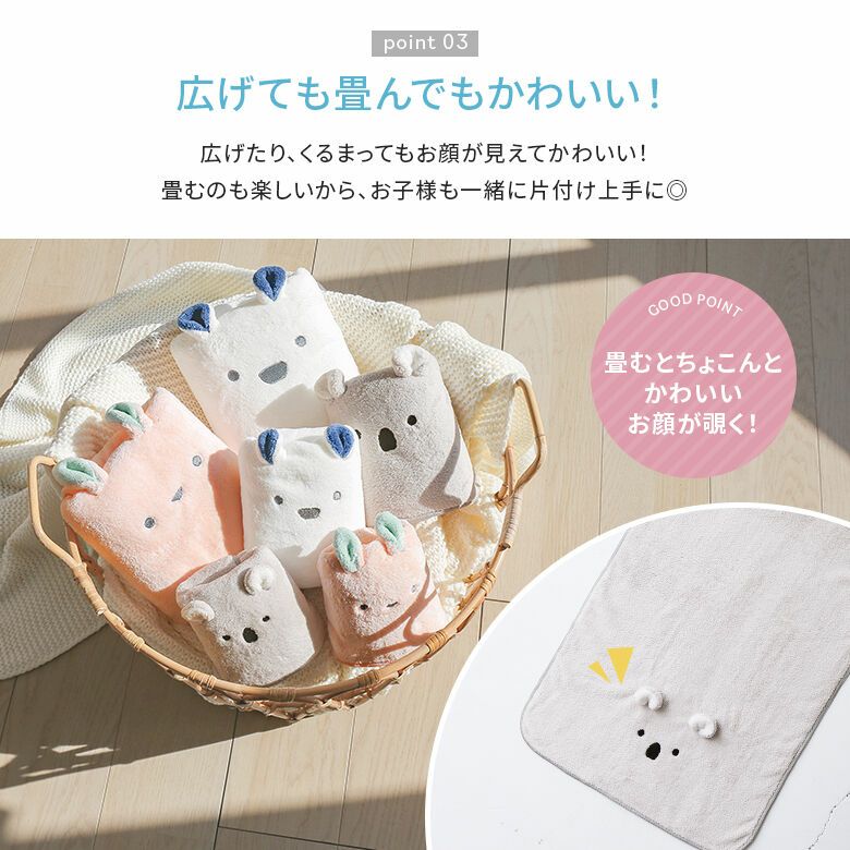 畳むとまるでぬいぐるのような、ぴょこんとした配色のお耳とお顔の刺繍がとっても可愛く、広げたり、くるまってもお顔が見えて思わず笑顔に。お子様と一緒に楽しく畳んでお片付けができるのも魅力です♪毎日のお風呂上りや、プールや海などのお出かけの日にも活躍します。
