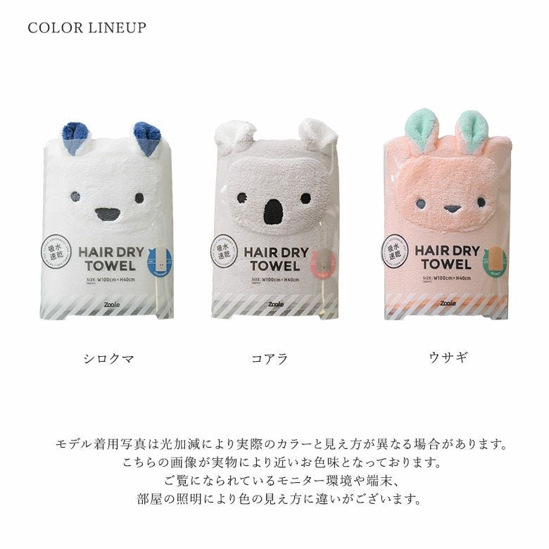 見た目も楽しめる、吸水アニマルヘアドライタオルです。