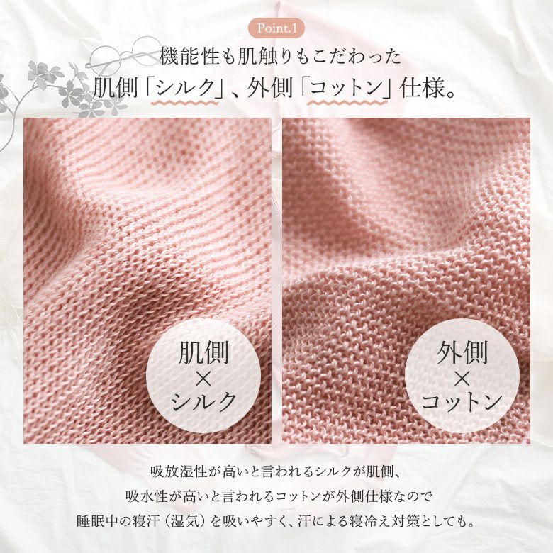機能性も肌触りもこだわった肌側「シルク」、外側「コットン」仕様。睡眠中の寝汗(湿気)を吸いやすく、汗による寝冷え対策としても使用できます。
