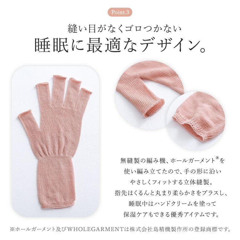 縫い目がなくゴロつかない睡眠に最適なデザイン。睡眠中はハンドクリームを塗って保湿ケアもできる優秀アイテムです。