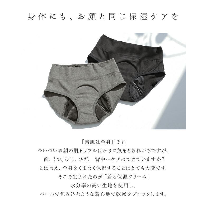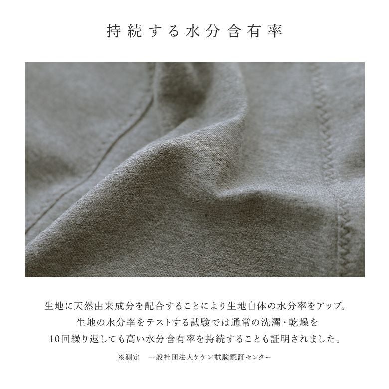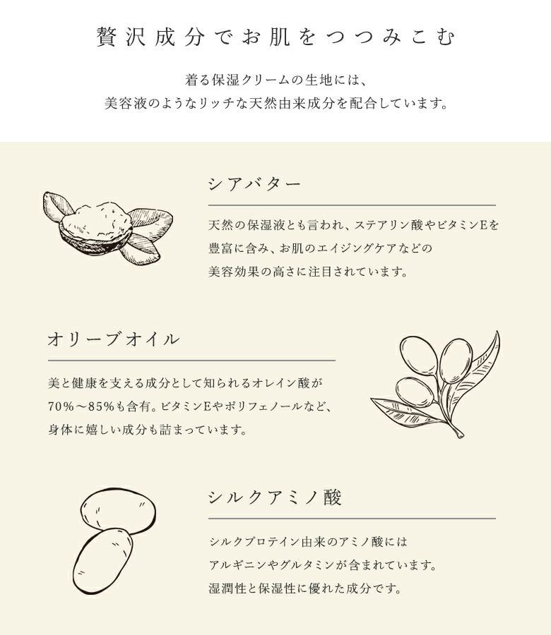 シアバター、オリーブオイル、シルクアミノ酸の3種類のお肌に優しい天然由来成分を配合した、水分率の高い本体生地はまるで”着る保湿クリーム”。贅沢成分でお肌を包みこみ、乾燥からお肌を守ります。